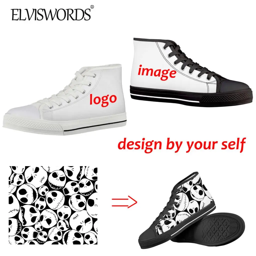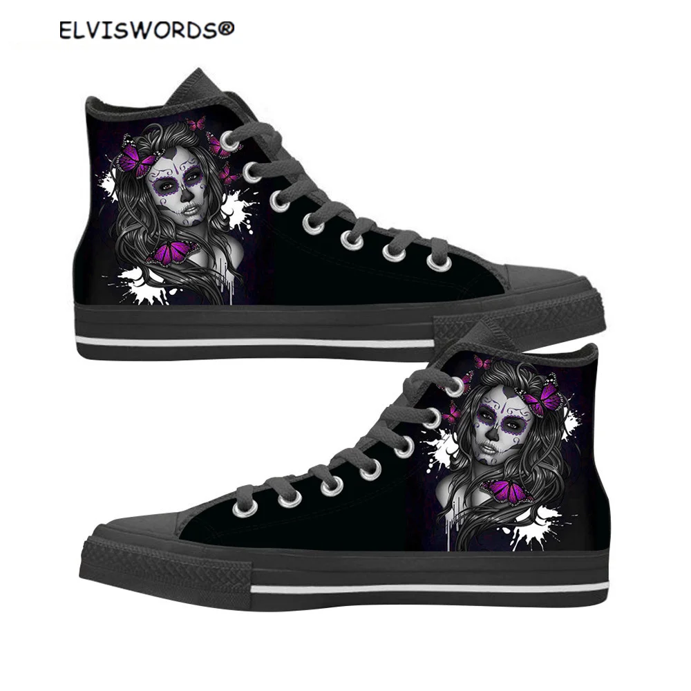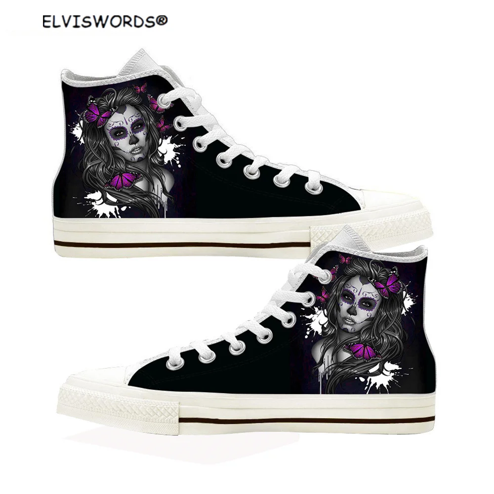 ELVISWORDSСтильные повседневные женские высокие кроссовки с цветочным принтом и черепом; Удобная женская Вулканизированная обувь; Парусиновая обувь