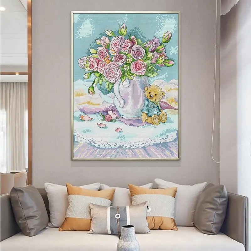 Ваза с изображением медведя и розы, вышивка крестиком, цветочный узор 14CT 11CT, печать на холсте, DMC, сделай сам, вышивка, рукоделие, набор для шитья