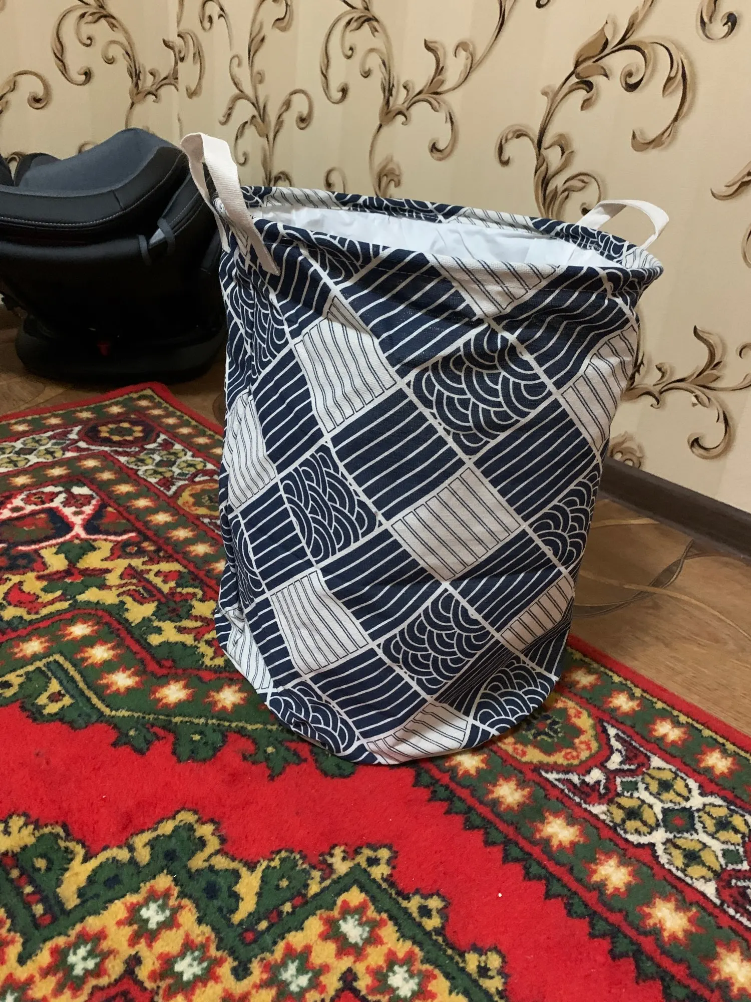 Внутри корзины нет подпорок, но за счёт очень жёсткой ткани держит свою форму. По размеру отлично
