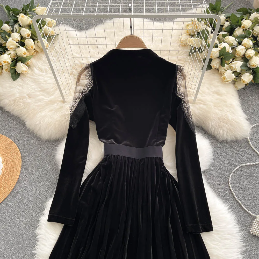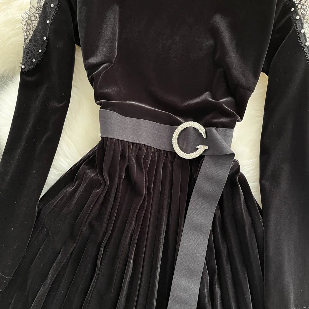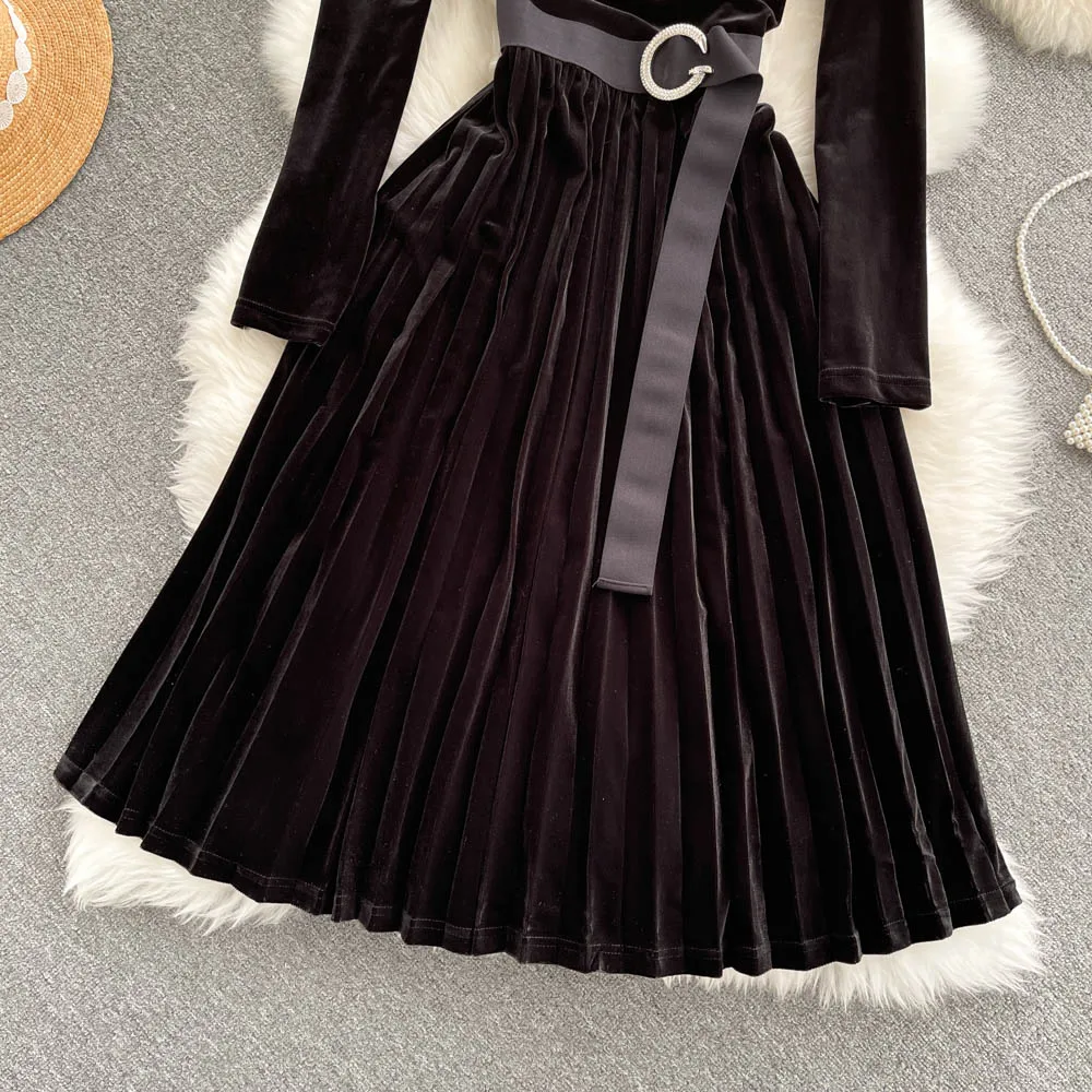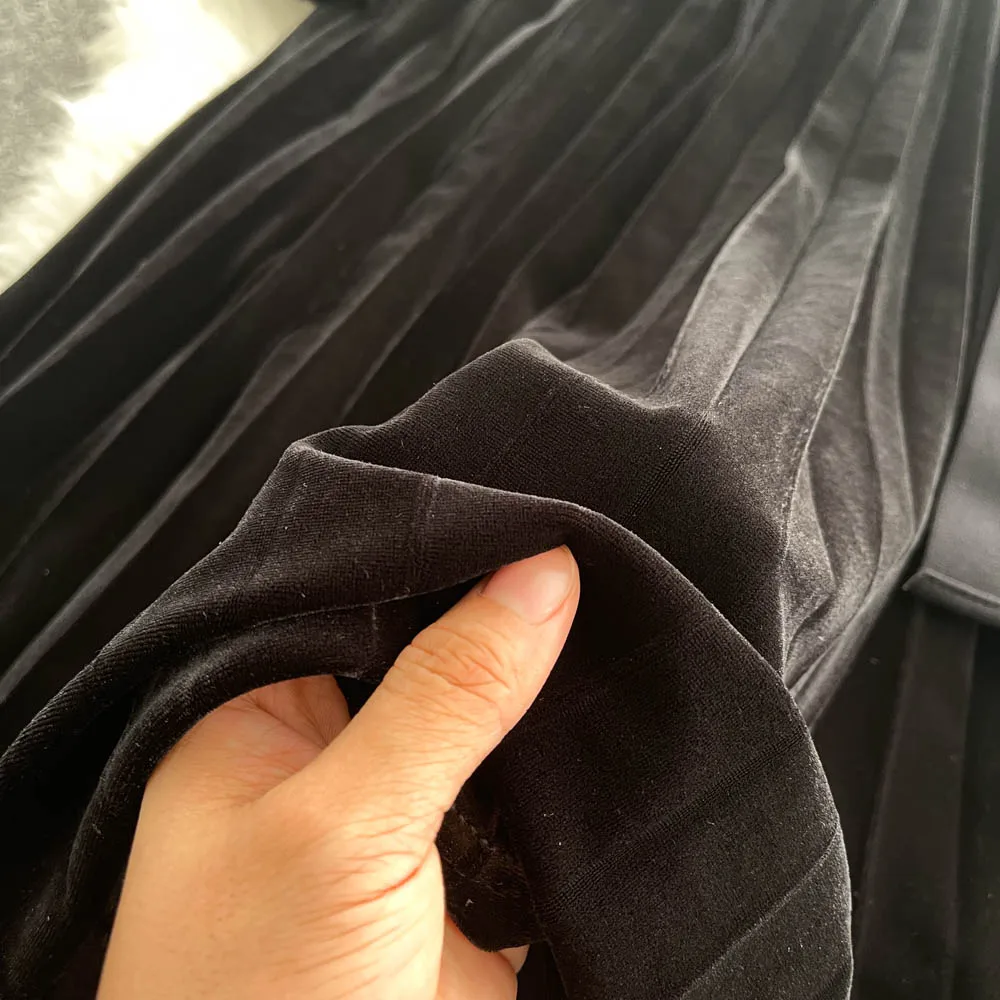Осенне-зимнее вельветовое платье, женское однотонное плиссированное платье с круглым вырезом и длинным рукавом, размера плюс, элегантные винтажные вечерние платья для женщин