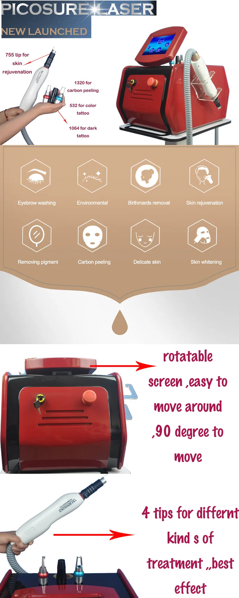 * 1064нм, 532 нм головка может сделать удаление татуировки, удаление eyeline и т. Д.