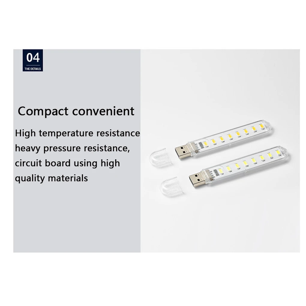 Этот тип USB лампы имеет небольшой размер и вес, удобный для хранения и переноски светильник, не будет занимать много места.Этот ночной Светильник USB подходит для компьютера, ноутбука, блока питания и других устройств, вы можете использовать его при чтении, ходьбе или других занятиях.USB лампа термостойкая и устойчивая к давлению, вы можете использовать ее в течение длительного времени, потому что печатная плата изготовлена из прочного материала.Светильник USB разработан с универсальным usb-портом, удобным в использовании, и работает с 3/8 бусинами, удовлетворяя ваши ежедневные потребности.Светильник USB работает с более низким током, обеспечивая безопасность, вы можете использовать его без беспокойства.Спецификация:Материал: Поликарбонат.Цвет: холодный белый, теплый белый.Размер: 5,8*1,8*0,9 см/10,1*1,8*0,9 см.Бусинки: LED5730 * 3/8 бусины.Входное напряжение: 3-5 В.Рабочий ток: 500 мА.Освещение: 200 лм.Цветовая температура: 3000K, 7000K.Посылка включает в себя:1/2 шт. Ночной светильник.