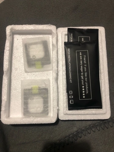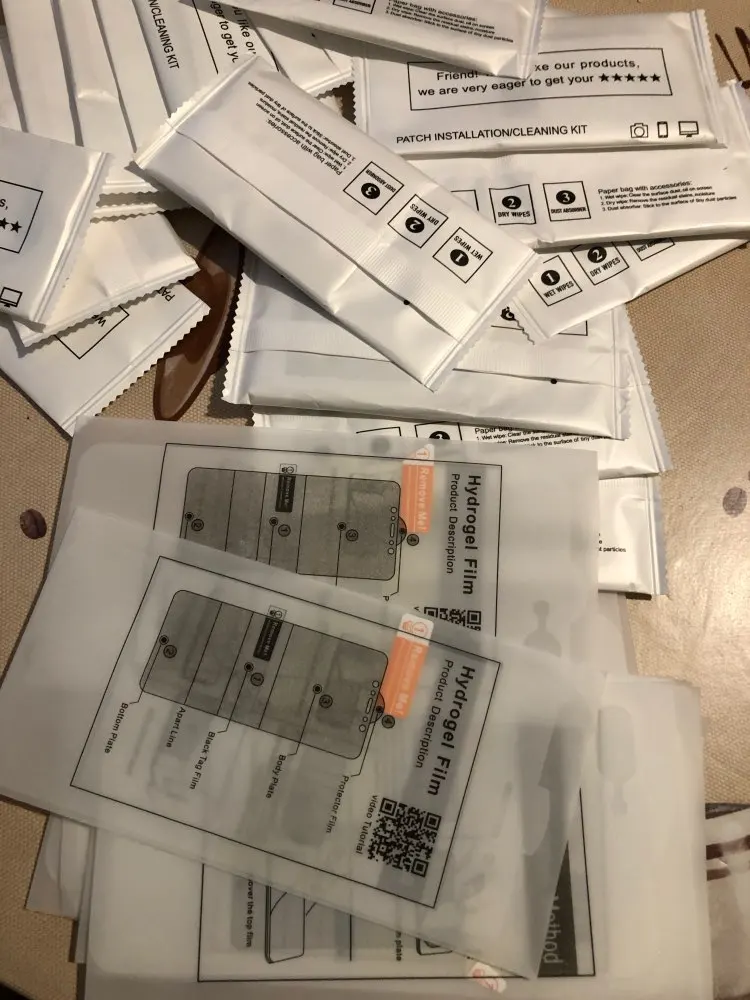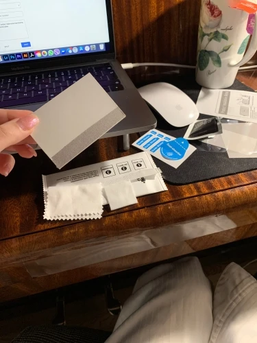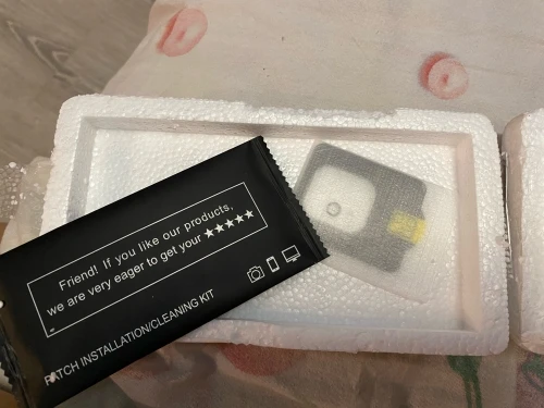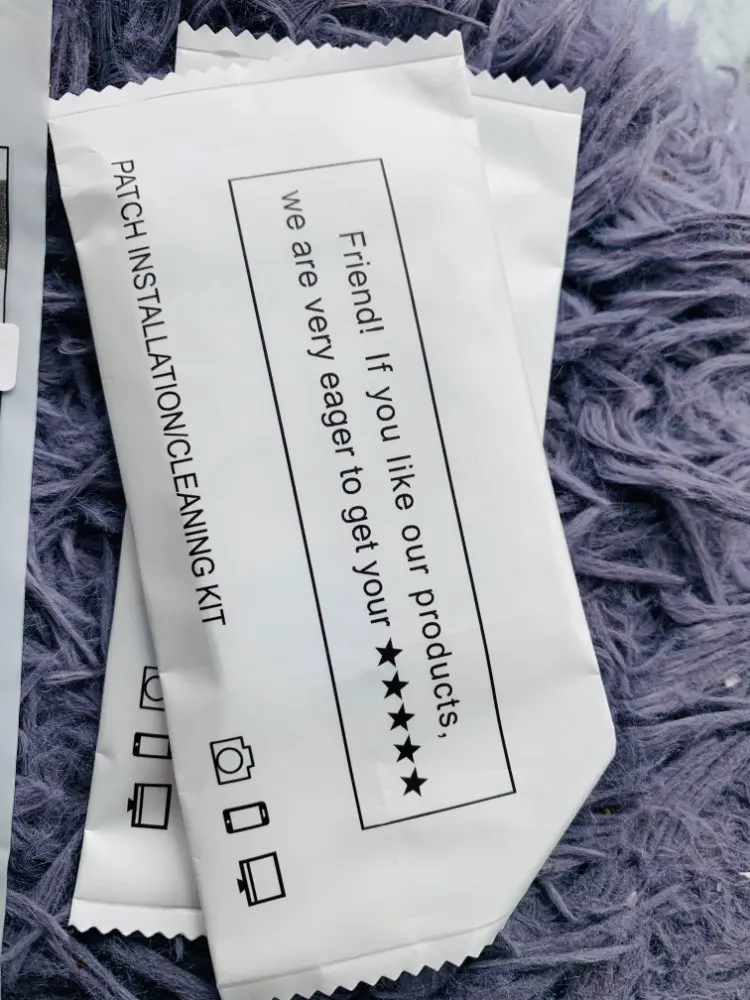 В наборе есть все что требуется для наклейки — салфетка вкладная/сухая и клейкие патчи от пыли.