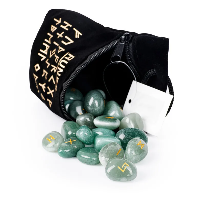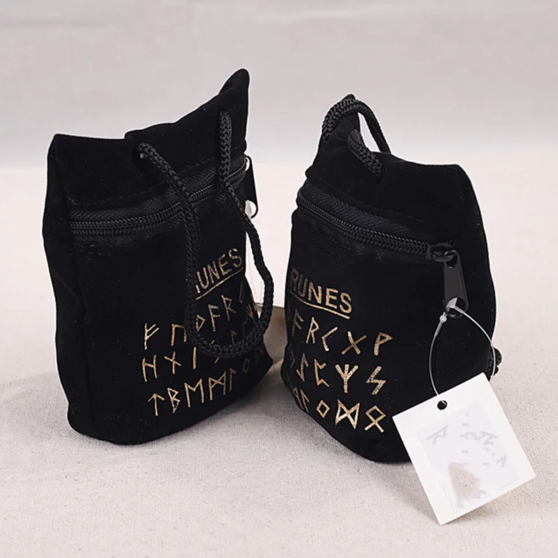 5. Набор из 25 камней в Руне, включая 24 камня с выгравированным руническим алфавитом золотыми буквами и одним пустым камнем. Поставляется в бархатной сумке на молнии и с инструкцией.