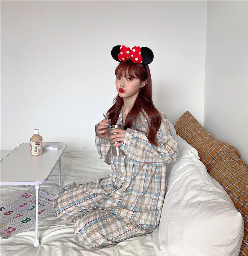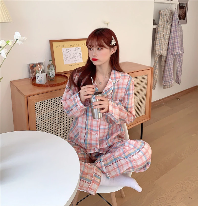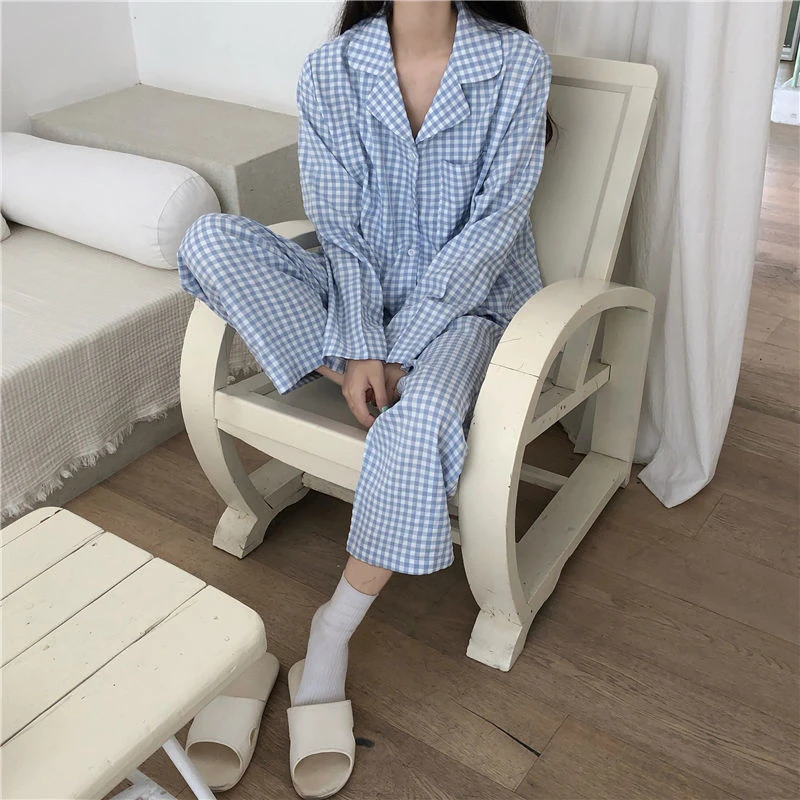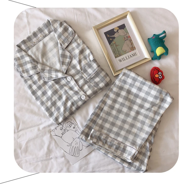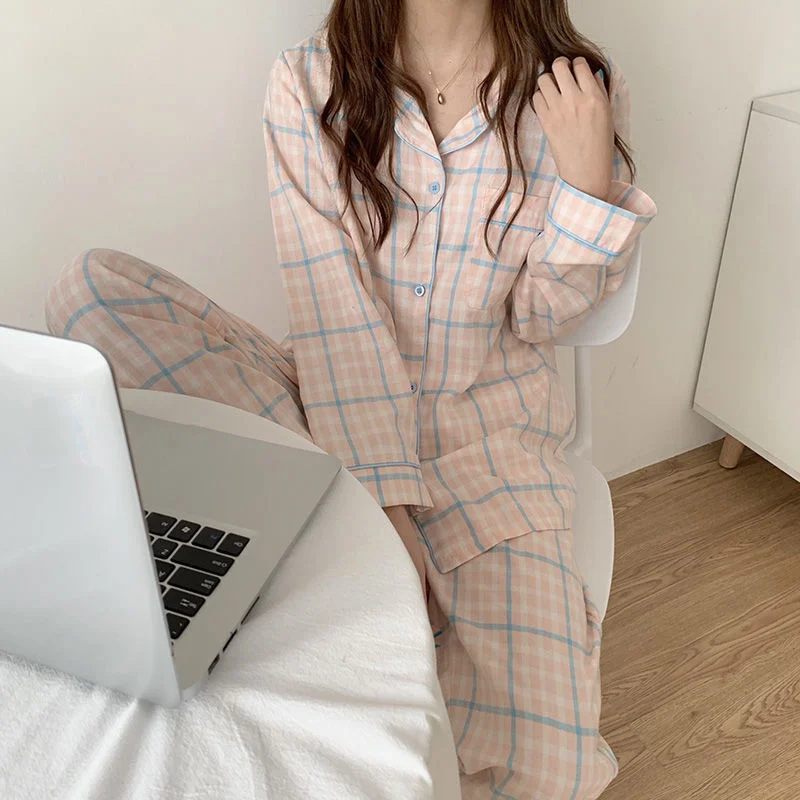 Пижамный комплект в клетку с принтом, Милая женская домашняя одежда, Кардиган с длинным рукавом, пижама, 2 шт., Студенческая одежда для сна, Новинка осени 2022