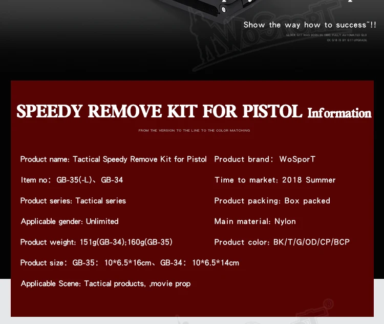 Название продукта: Тактический комплект быстрого удаления для пистолетаНомер товара: GB-35Вес нетто: около 0,15 кгВес брутто продукта: около 0,23 кгЦвет изделия: BK,T,G,OD,CP,BCPОсновной материал: нейлонПосылка включает в себя: 1 * кобура для пистолета