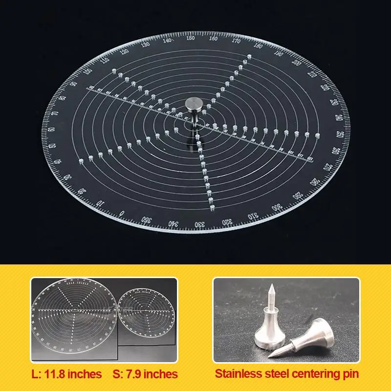 Прозрачный акриловый материалТокарный центр детектор изготовлен из прозрачного акрила, который достаточно толстый,С центральным отверстием и четко обозначенным кругом, что позволяет точно видетьЧто вы делаете, помогая вам быстро и легко измерить.