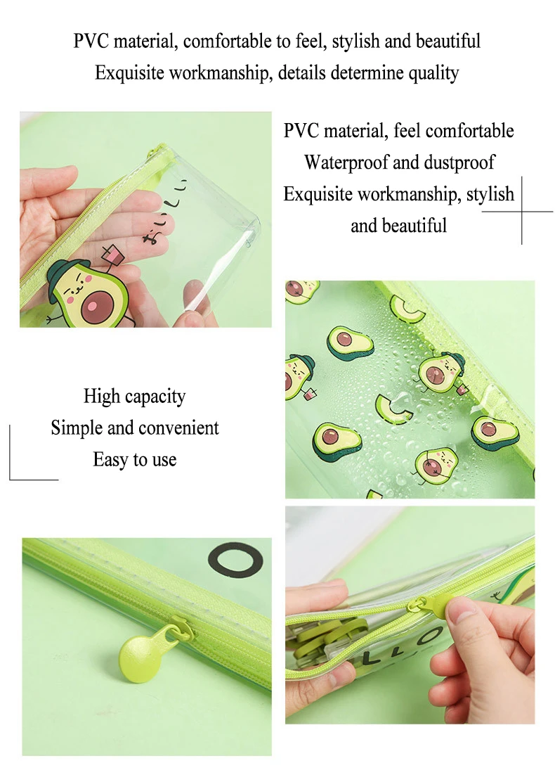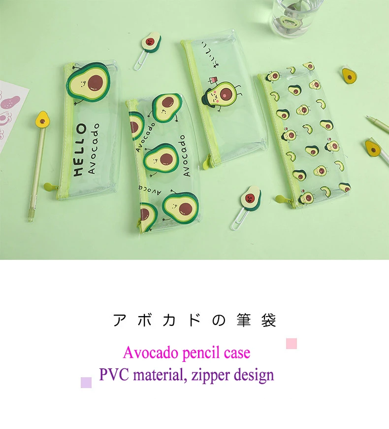 Прозрачный чехол для карандаша с зеленым авокадо, Студенческая простая вместительная сумка для канцелярских принадлежностей с японским мультяшным рисунком