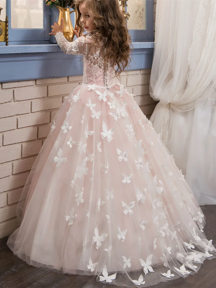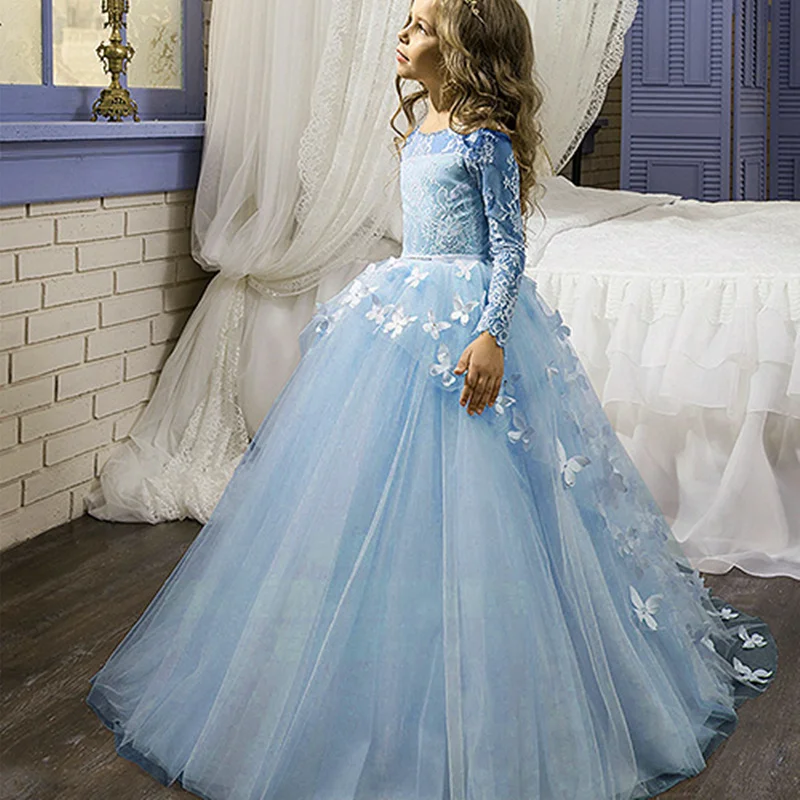 Платье для первого причастия для девочек, платье с открытой спиной и цветочной аппликацией для девочек, бальное платье с бантом из тюля, пышные платья для девочек