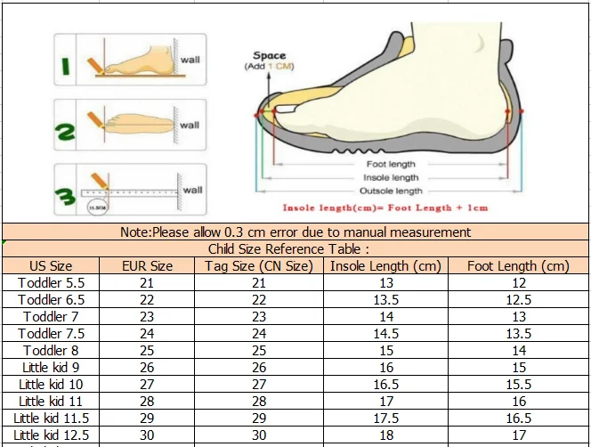 Поскольку все размеры детской обуви отличаются, при заказе детской обуви вы должны соответствовать нашим размерам и внутренней длине.