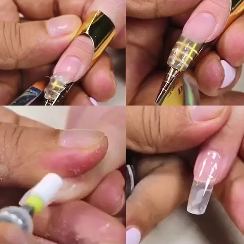 1. Нарежьте ногти пилкой.2. Нанесите волокнистый гель и вылечите его. (Лечение: 30 секунд в светодиодной лампе, или 2 минуты в УФ-лампе.)3. Нанесите первый слой цветного покрытия и вылечите его. (лечение: 30 секунд в светодиодной лампе, или 2 минуты в УФ-лампе.)4. Повторите 3 шага.5. Нанесите верхнее покрытие и вылечите его.