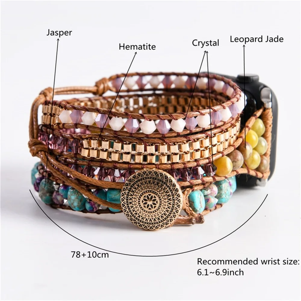 Стиль: Бохо и БогемияРемешок для часов ручной работыМатериалы: Камень, нержавеющая стальДлина браслета: 32,5 дюймов (размеры сделаны вручную, имеют ошибки, пожалуйста, обратитесь к фактическому продукту)Совместимость: Браслет для apple watch38 мм/40 мм, 42 мм/44 ммДля мужчин и женщин, совместим сСерия SE 7/6/5/4/3/2/1Ювелирные изделия ручной работы: Браслет для часов из бисера высокого качества, 7 Чакр из натурального камня 4 мм. Дизайн структуры стиля обертывания сочетает в себе бусины и цветовое сочетание, сделает вас счастливыми и яркими.