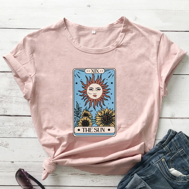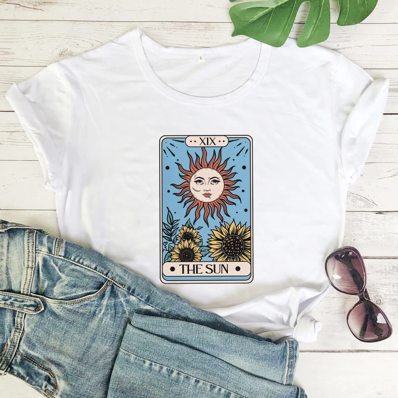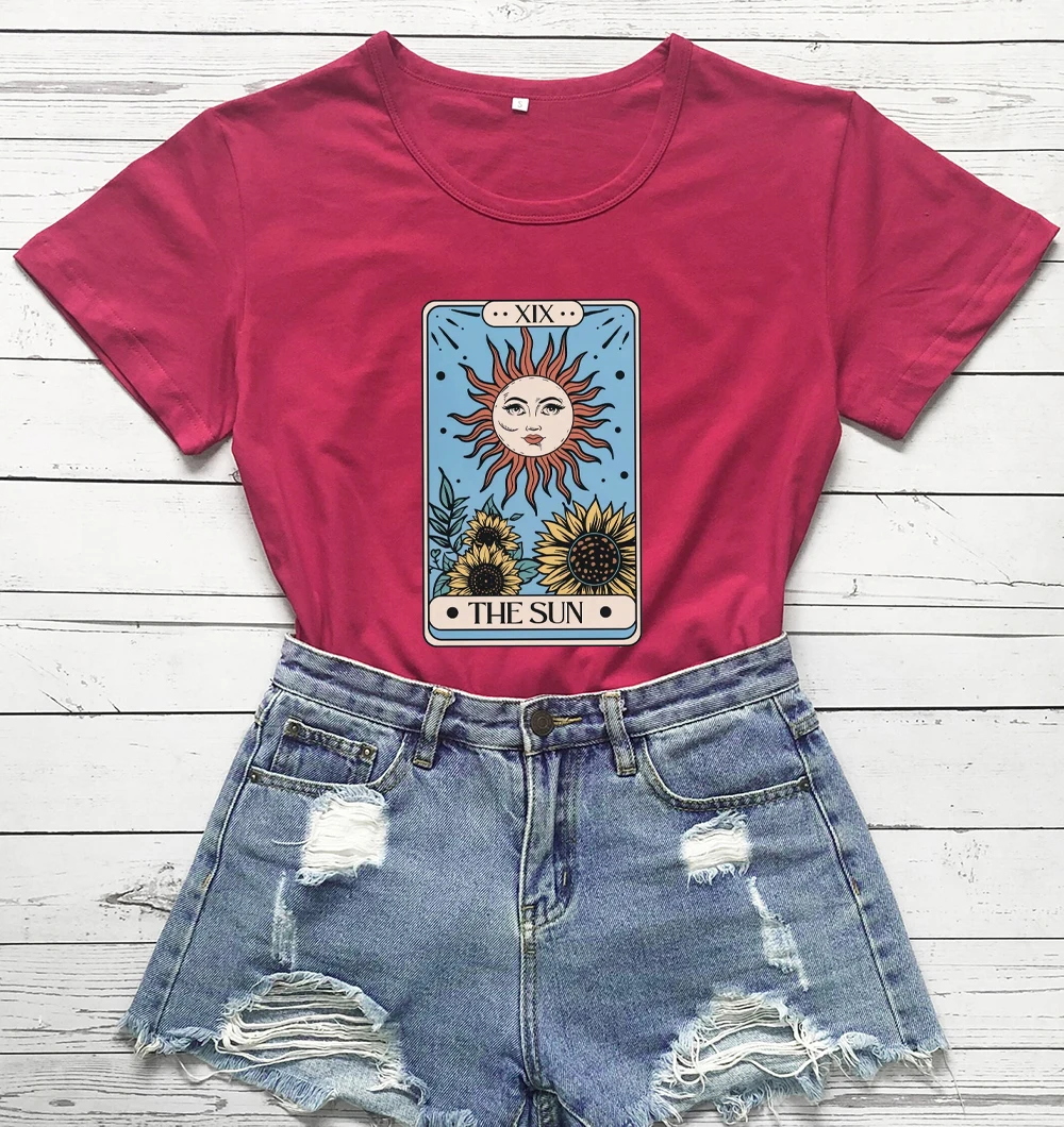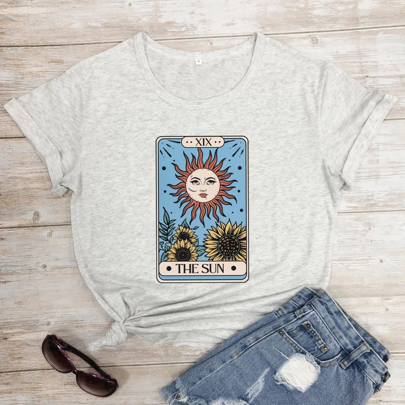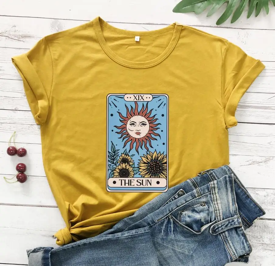 Футболка с рисунком карты Таро и солнца, цветная рубашка с рисунком солнца и подсолнухов, женская футболка в стиле Небесно-восточной эстетики, повседневный винтажный Топ