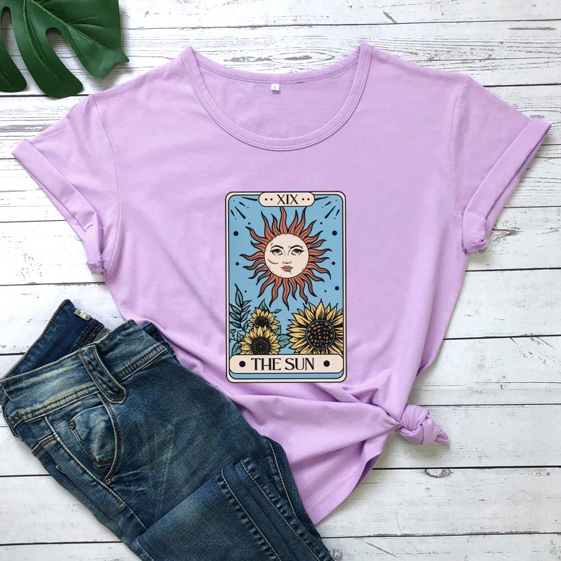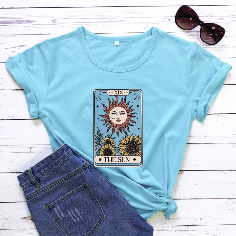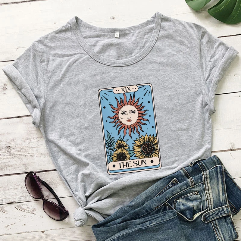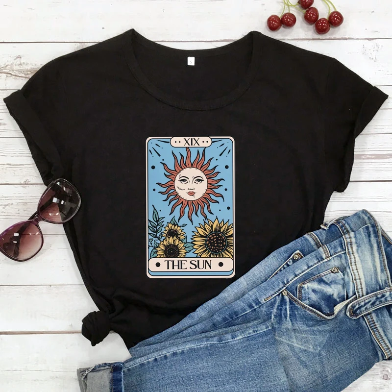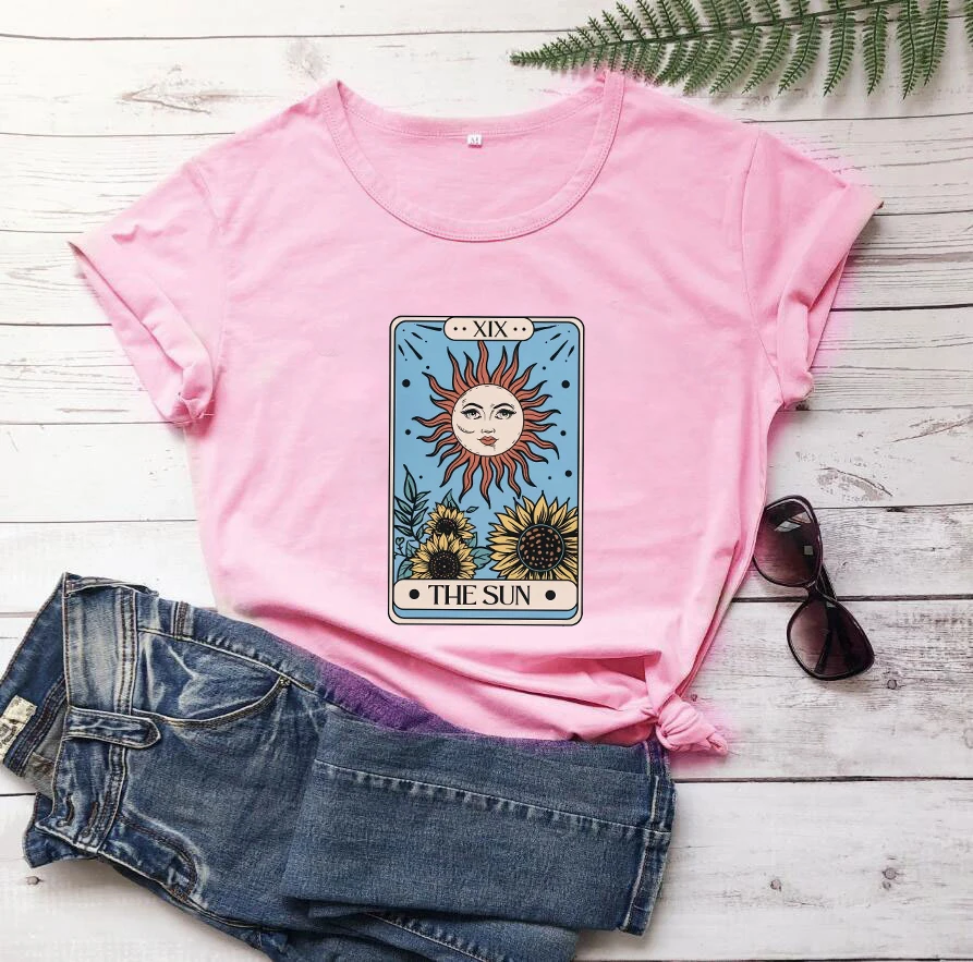 Футболка с рисунком карты Таро и солнца, цветная рубашка с рисунком солнца и подсолнухов, женская футболка в стиле Небесно-восточной эстетики, повседневный винтажный Топ