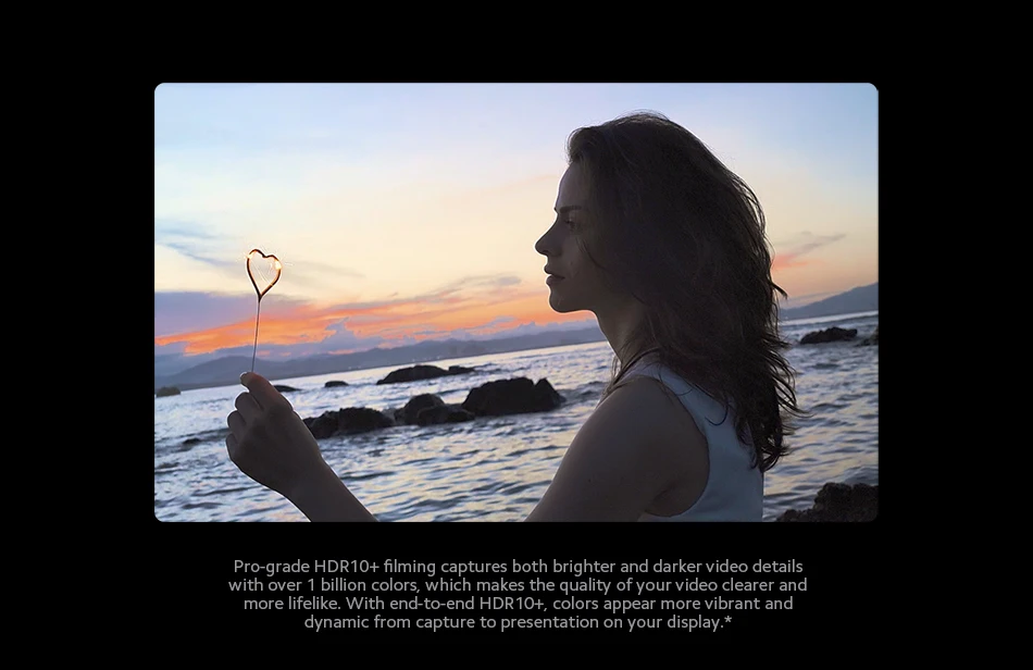 Профессиональный HDR10 + снимает более яркие и темные детали видео с более чем 1 миллиардом цветов, что делает качество вашего видео более четким и реалистичным. С сквозным HDR10 + цвета выглядят более яркими и динамичными от захвата до презентации на вашем дисплее. *