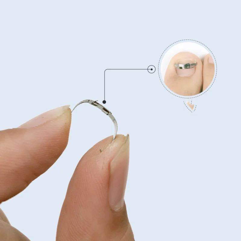 Ортопедическая Пряжка для ногтей изготовлена из композитного материала с хорошей гибкостью и эластичностью. Ортопедическая Пряжка для ногтей наклеивается на поверхность ногтя, которая может генерировать повышенную эластичность, постепенно вытягивая ноготь, который растет во плоти, изменяя направление роста, И позволяет ногтям больше не расти в плоти.