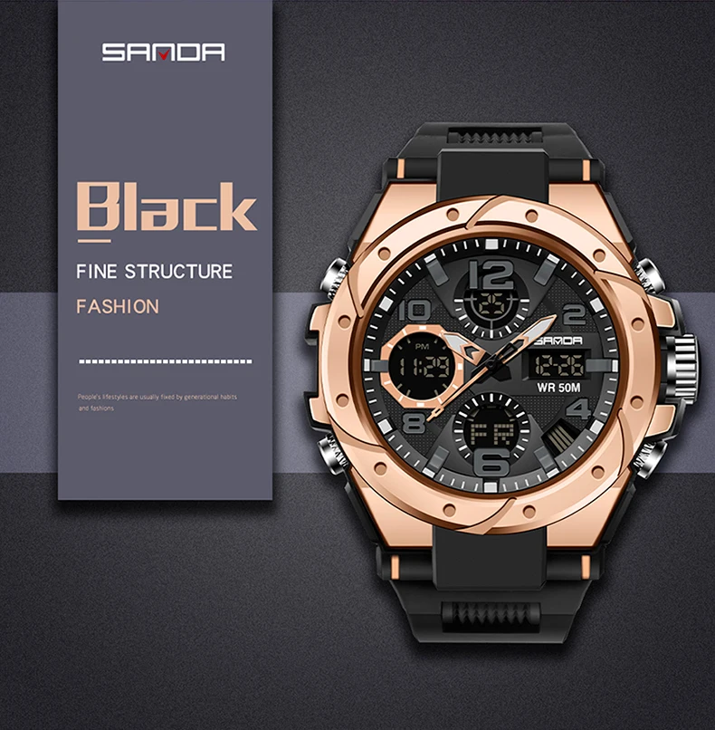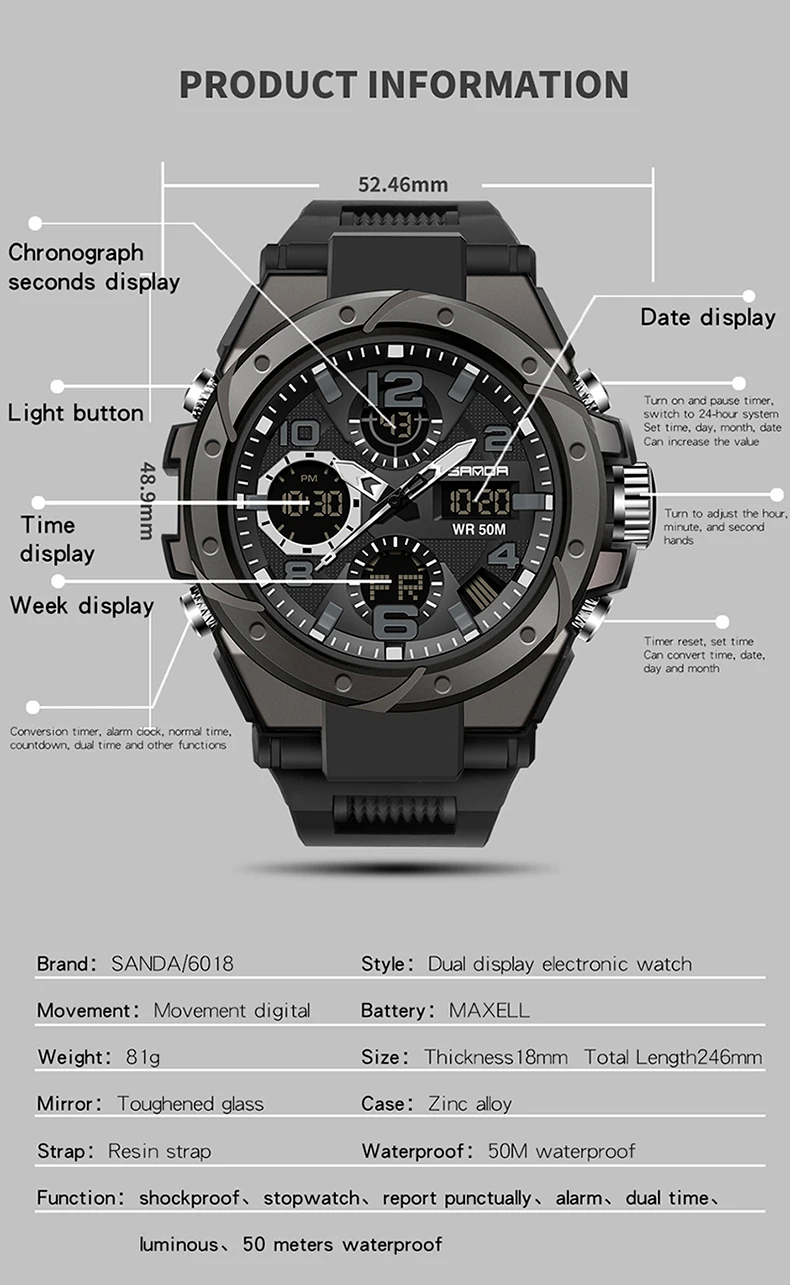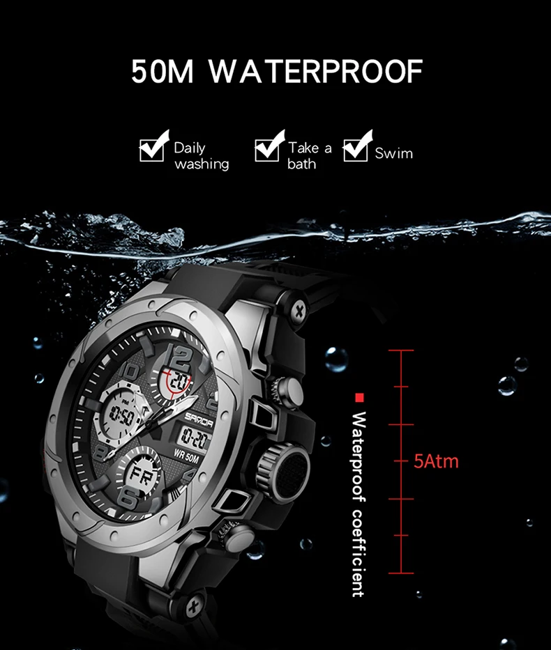 Часы наручные SANDA мужские с цифровым указателем, спортивные ударопрочные кварцевые, с секундомером, водонепроницаемость 50 м, 6008