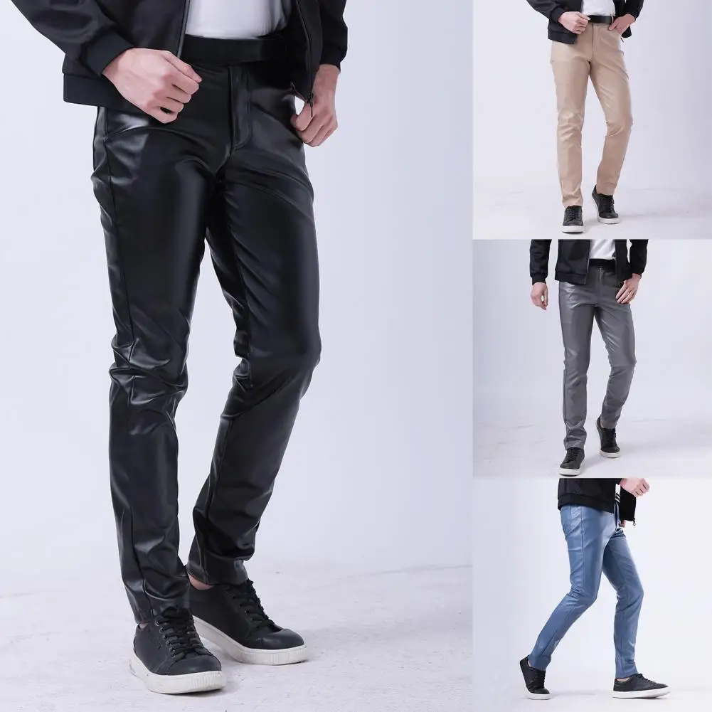 Длинные кожаные брюки, мужские однотонные Гладкие брюки-карандаш на...
