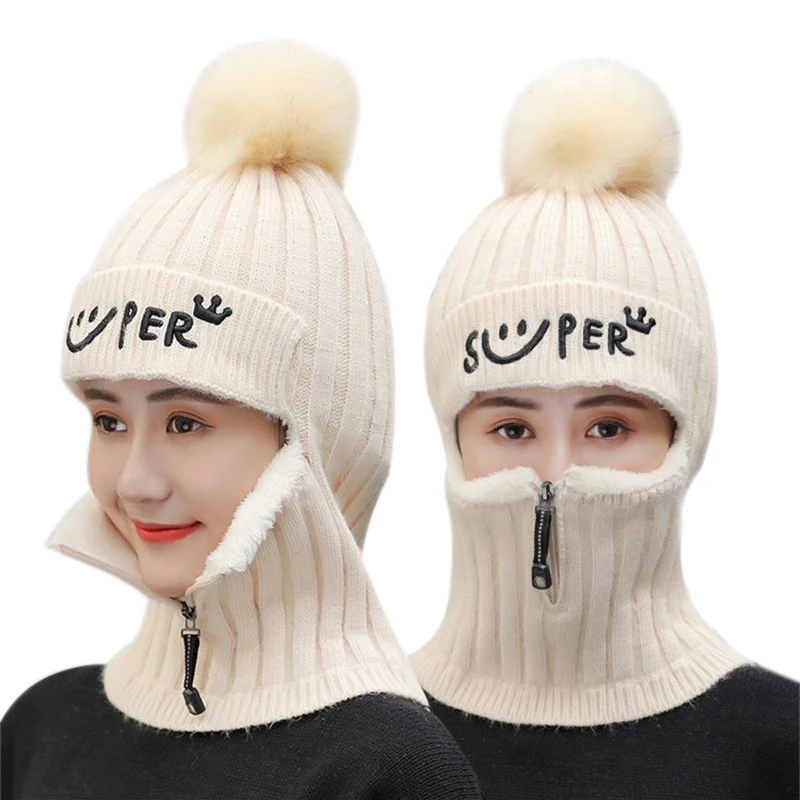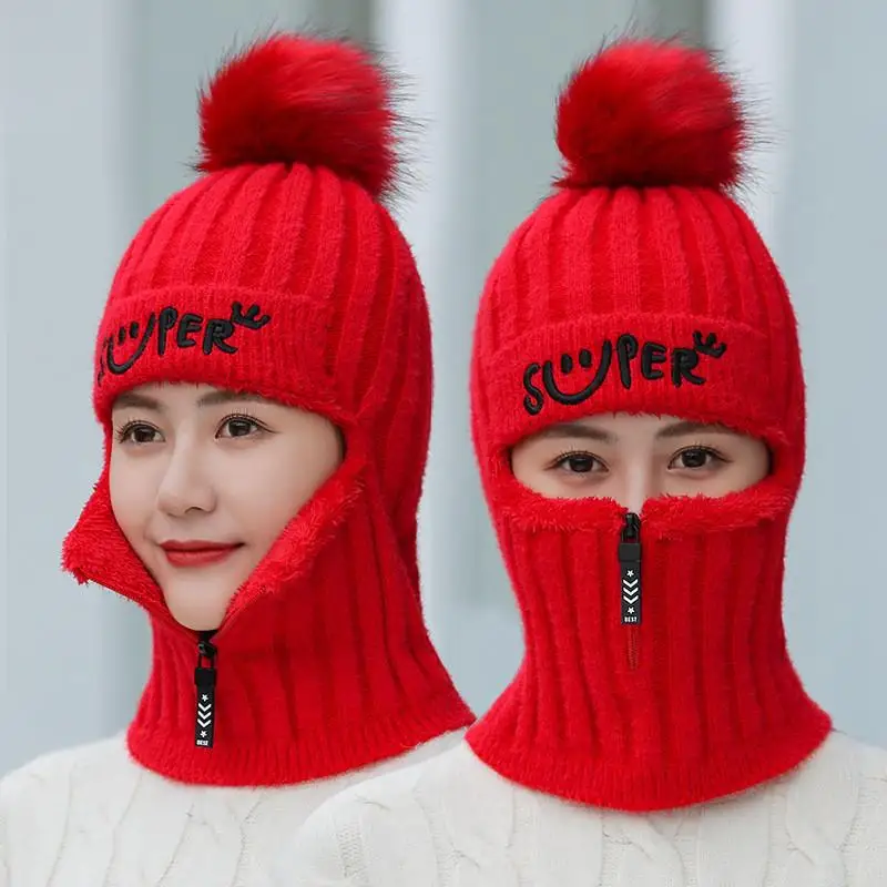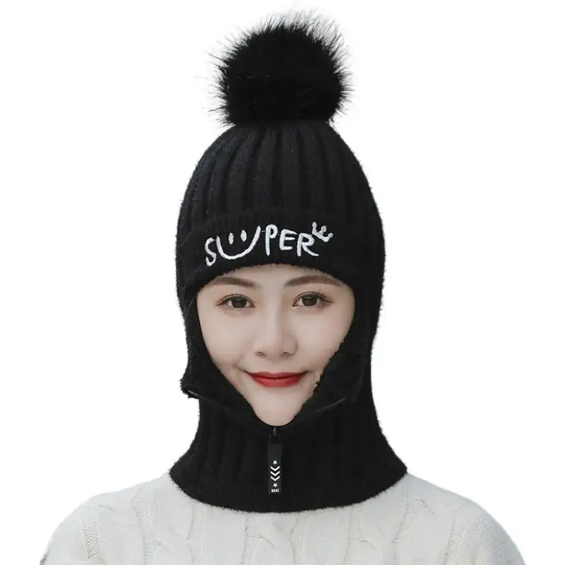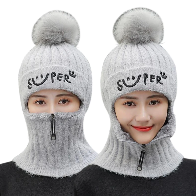 Модная зимняя теплая вязаная шапка плюшевая шапка из кроличьего меха цельный головной убор на молнии с защитным лицом и шеей осенние шерстяные шапки