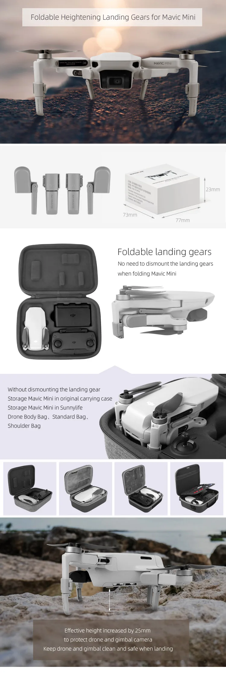 -Подходит для DJI Mavic Mini Drone,-Посадочная Шестерня может эффективно защищать дроны и шарнирные линзы,-Можно сложить для удобного использования и хранения,-Легко устанавливается и снимается, очень прочный,-Легкий и не добавляет веса дрону.