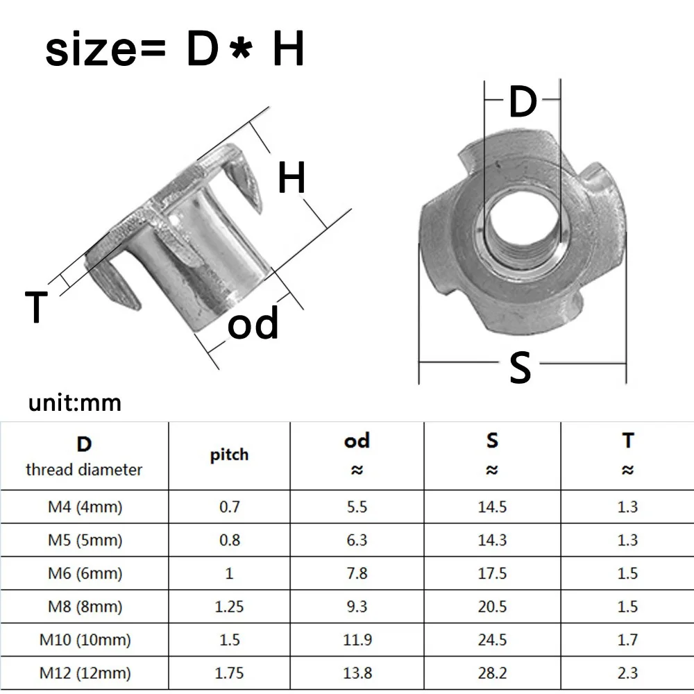 Т-образная гайка M3 M4 M5 M6 M8, оцинкованная, с 4 зажимами, мебель...