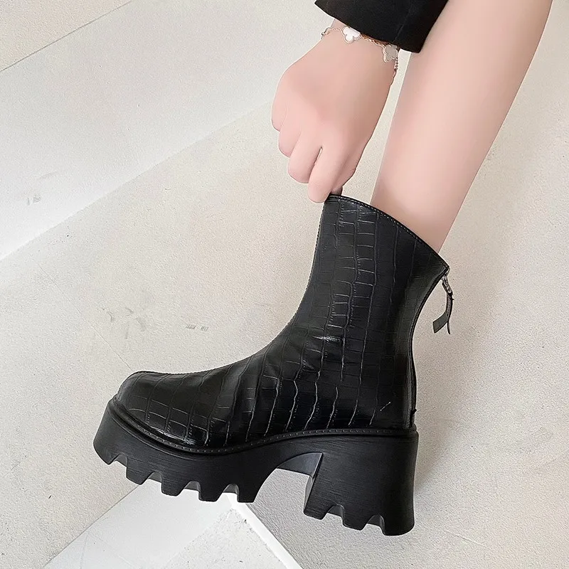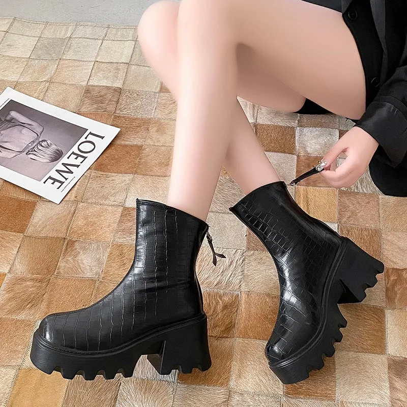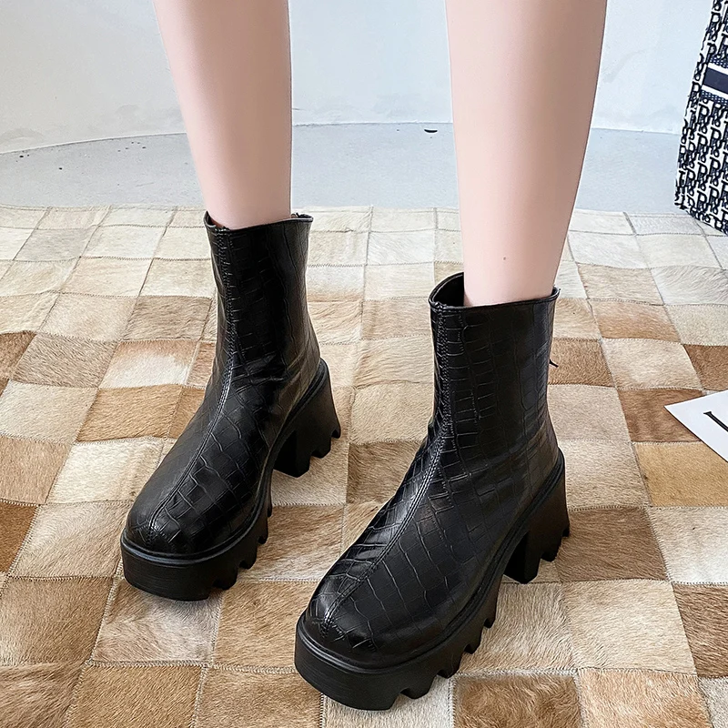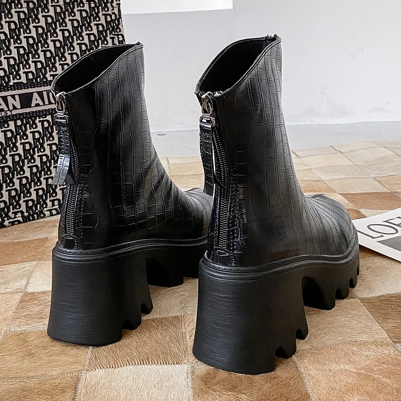 Женские ботильоны на платформе и толстом каблуке, однотонные черные ботинки из мягкой кожи на молнии, осень 2021