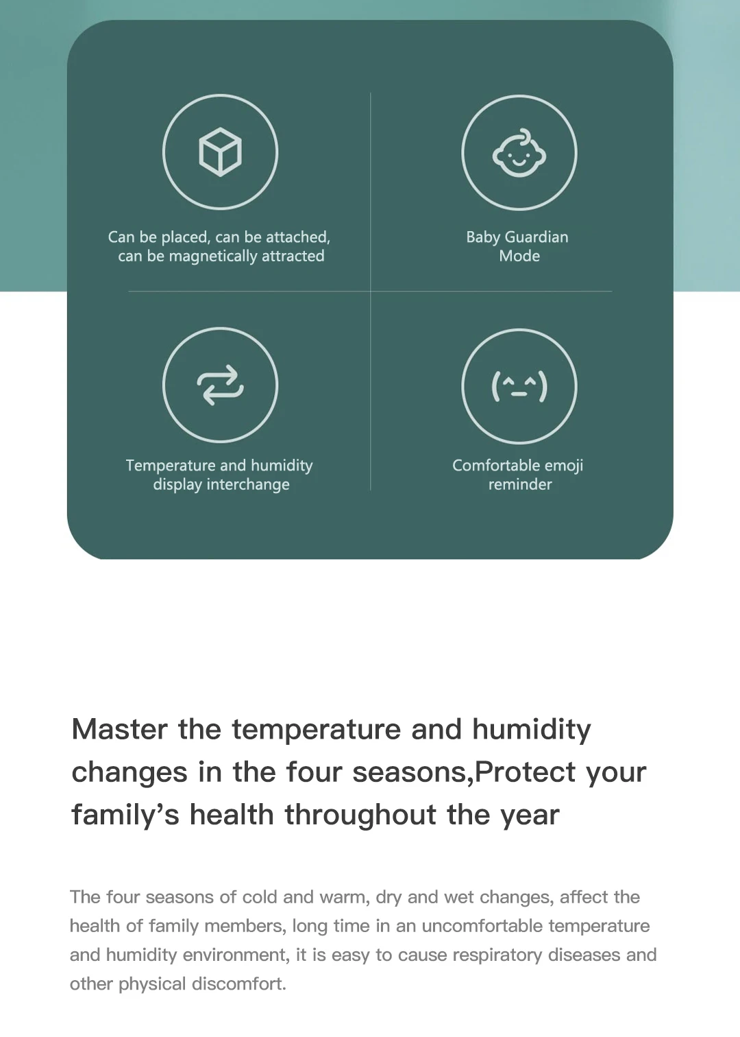 Опишите 1. В качестве дисплея выбран электронный чернильный экран размером 35 мм x 35 мм. Черно-белый дисплей четко близок к бумажной текстуре дисплея, мягкий и не повреждает глаза, и его можно четко видеть под разными углами. 2. Встроенный Швейцарский Высокоточный цифровой датчик, тонкие изменения температуры и влажности, вызванные дыханием, также могут быть признаны духом, напоминаем Вам и Вашей семье о том, чтобы вовремя регулировать температуру и влажность для улучшения комфорта в помещении. 3. Со встроенными магнитами Прикрепите заднюю крышку с кронштейном/наклейкой на стену к изделию и поместите ее на рабочий стол спальни/гостиной, вовремя обнаружите изменения температуры и влажности, мобилизация оборудования связи и делает дом более комфортным; Наклейте на стену ванной комнаты/помещения для хранения для увлажнения и проветривания во времени, чтобы предотвратить рост бактерий и микроорганизмов; адсорб на поверхности железных предметов, таких как двери холодильника/полки, чтобы быть в курсе изменений температуры и влажности на кухне 4. Он может хранить данные о температуре и влажности. После подключения к приложению MI hone, после добавления и подключения устройства, загрузите данные в облако через мобильный телефон или шлюз Bluetooth и создайте кривую в приложении, позволяет интуитивно понять изменения температуры и влажности mi dity. 5. Тщательно разработанная защита от детей, когда температура в помещении или hu mi dity превышает комфортную зону ребенка, приложение Mi hone автоматически изменит mi nd и предоставит вам предложения по улучшению 6. Через шлюз Bluetooth, когда определенная температура/Влажность задан в приложении Mijia, другие устройства автоматически включаются или выключаются для достижения связи с смарт-устройствами, такими как кондиционеры, увлажнители воздуха, И электрические нагреватели. Технические характеристики Название: электронный термометр Xiaomi Модель: XMWSDJO4MMC CMIT ID:2021DP9681 Материал: PC/ABS, PMMA Размер: 56,2x56,2x12,8 мм Вес нетто: 32 г Номинальное напряжение: 3 В = Модель аккумулятора: CR2450 (устанавливается) Беспроводное подключение: Bluetooth 5,0 Bluetooth с низким энергопотреблением Диапазон измерения температуры: 0 ℃-60 ℃ Температура Разрешение дисплея: 0,1 ℃ Диапазон измерения влажности: 0%-99.9% RH Разрешение дисплея влажности: 0.1% RH Упаковочный лист 1x электронный термометр гигрометр 1x стикер на стену 1x кронштейн 1x Руководство пользователя