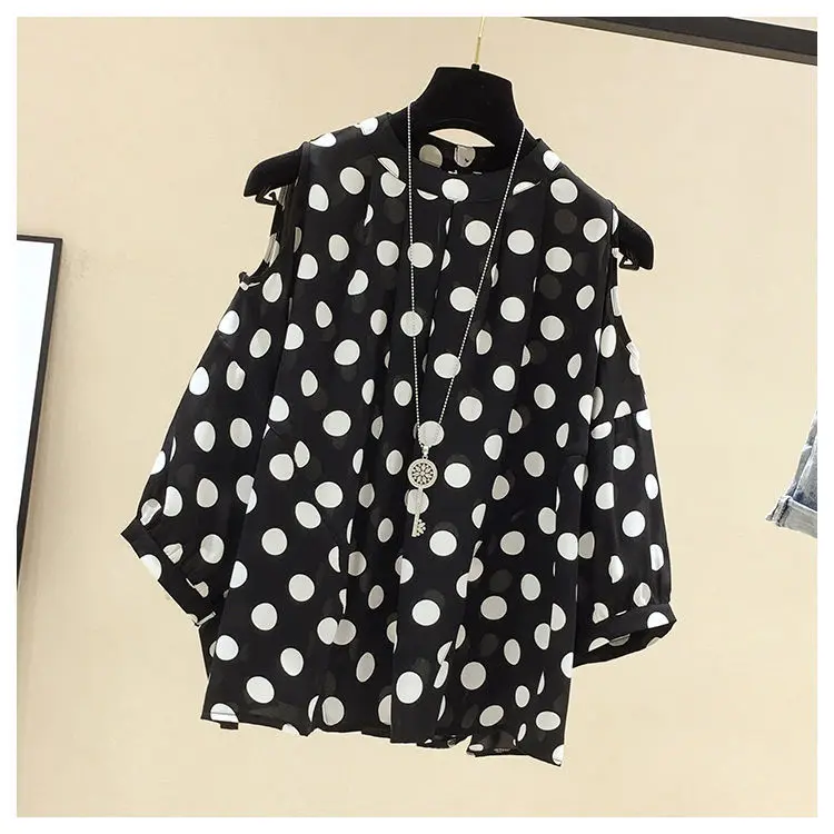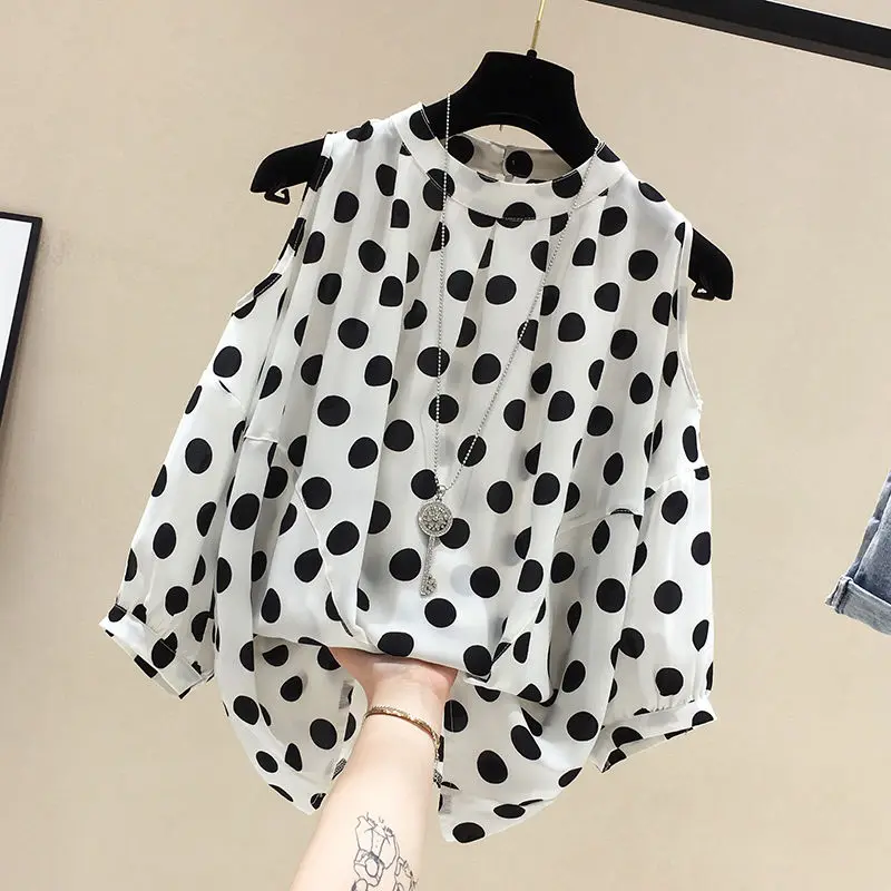 Женская шифоновая блузка в горошек, с длинным рукавом и высоким воротником