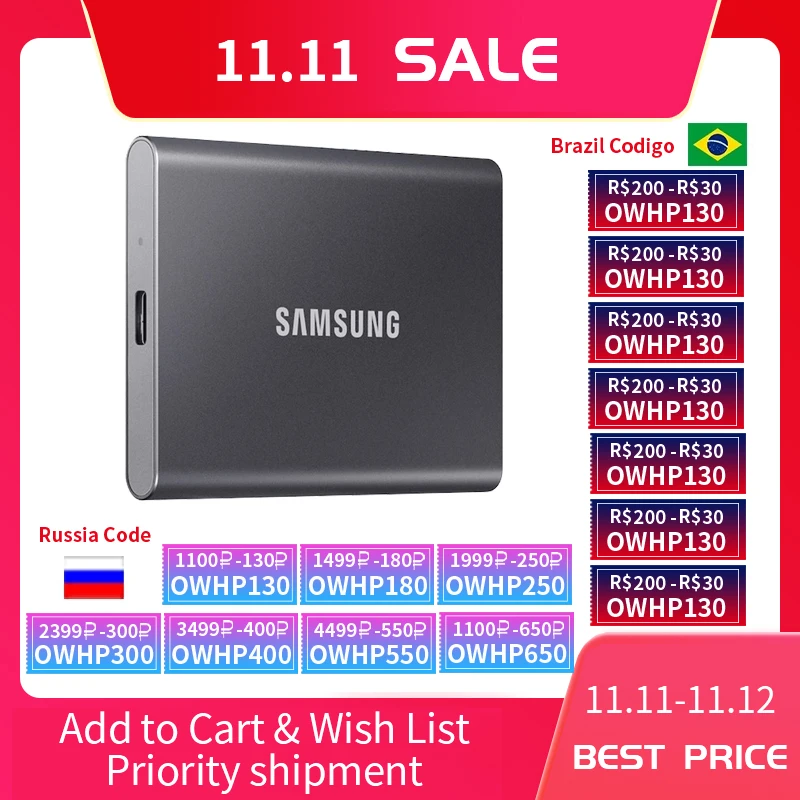 Легкий портативный накопитель SSD T7 карманного размера обеспечивает быструю скорость благодаря легкому и надежному хранению данных для передачи больших файлов. Независимо от того, храните ли вы важные бизнес-документы, игры или фильмы, портативный SSD T7 обеспечивает Скорость и долговечность в корпусе размером с ладонь. Представляем новый стандарт в внешнее запоминающее устройство, в наличии три мощности, чтобы удовлетворить ваши потребности: 500GB, 1 ТБ или 2 ТБ.