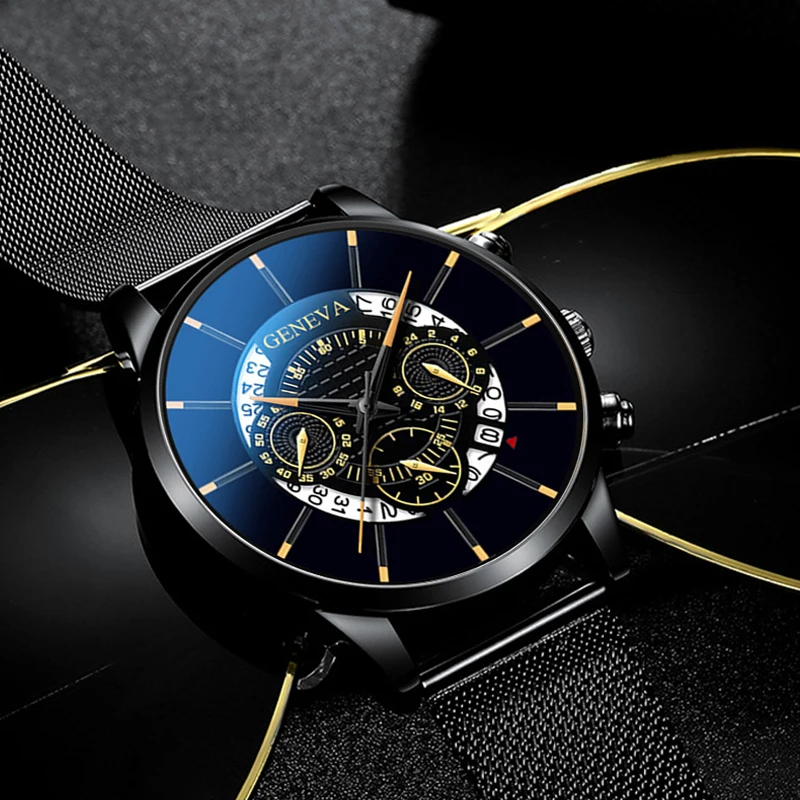 Часы мужские, с сетчатым ремешком из нержавеющей стали, синие, с ка...