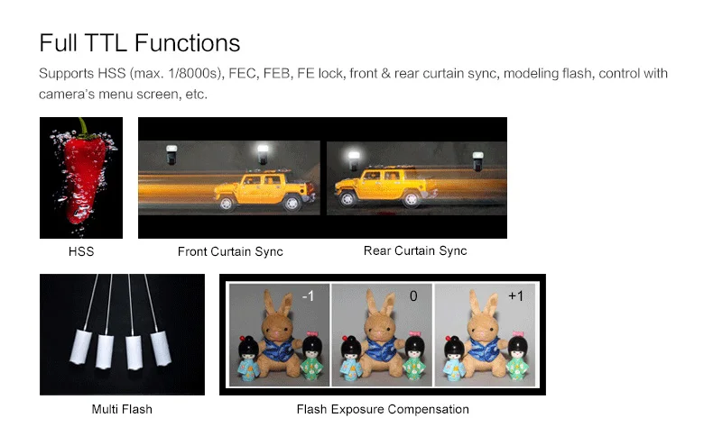TTL flashmode: легкий и быстрый для snapspecial momentsРежим многократной вспышки: легко записывать цепь быстро меняющихся ходовВысокий номер направляющей: 58 м/190ft (ISO 100, 105 мм)Авто/ручной масштабирование: идет в течение 24/28/35/50/70/80/105 ммЖК-дисплей: большой размер с подсветкойРециркуляция вспышки: 0,1-5s, Совместимость с внешним блоком питанияРасширенные функции: FV замокГоловка вспышки может поворачиваться на 90 градусов вперед и на 270 градусов по горизонталиЕсть штепсельная вилка синхронизации и 1/4 дюйма, удерживаемая по размеру. Вы можете установить эту вспышку на штатив или устройство с 1/4 "креплением. Поддержка высокой скорости синхронизации.Отражающая карта, придающая особое значение глазамШирокая панель, расширяющая охват вспышки до 14 мм, создавая мягкое и естественное освещение