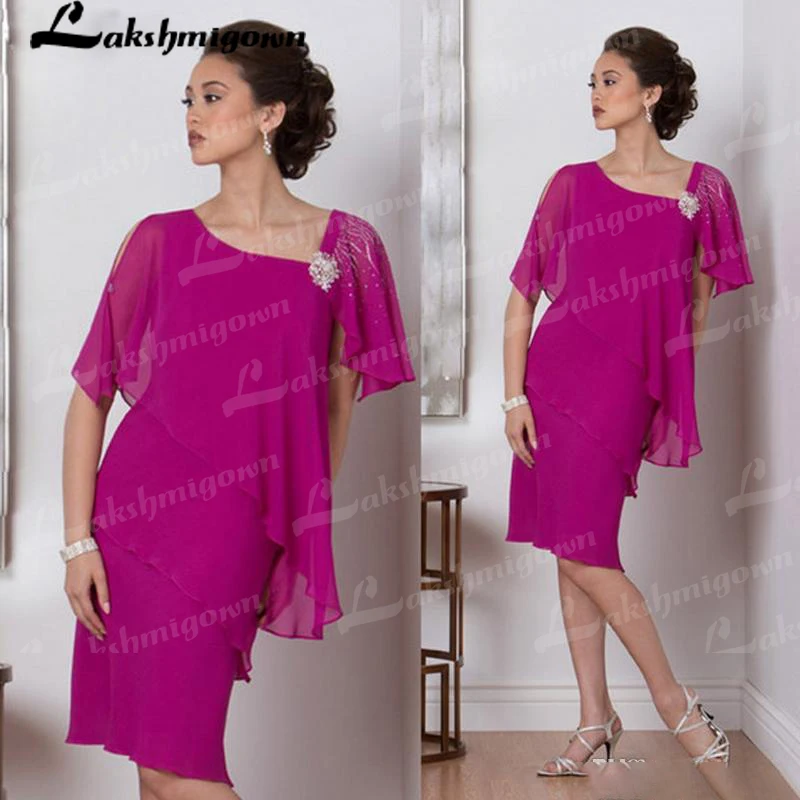 Фуксия платье для матери невесты длиной до колена с коротким рукавом и бусинами женское Многоярусное шифоновое платье для матери