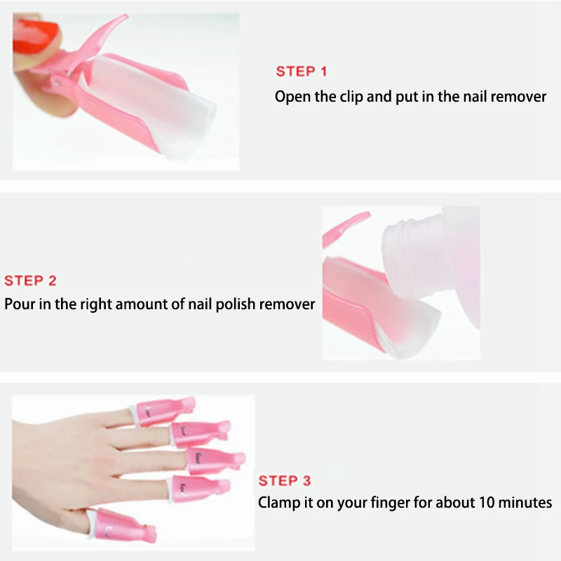 -Для удаления искусственных ногтей. Отделка лишний лак для ногтей.-Замачивание подушечек чистым ацетоном.-Нанесение промачивающих подушечек на искусственный ноготь.-Используя этот хранитель infibulate искусственные ногти и подушечки и держать около 10 минут.Инструкции по использованию:Шаг 1: сначала отполируйте ногти.Шаг 2: Поместите хлопок в зажимы.Шаг 3: налейте немного жидкости для снятия геля.Шаг 4: Поместите палец в зажимы и подождите 10 минут.Шаг 5: Используйте толкатели для кутикулы, надавите на поверхность ногтя.Шаг 6: Затем лак для ногтей можно аккуратно удалить.