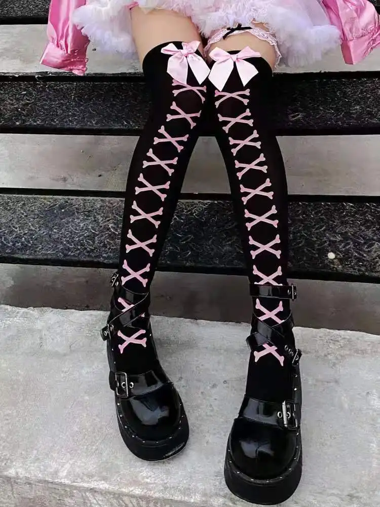 Новинка, женские чулки до бедра из шелка, милая сетчатая юбка, милый бант выше колена с черным бантом, сексуальные чулки на подтяжках