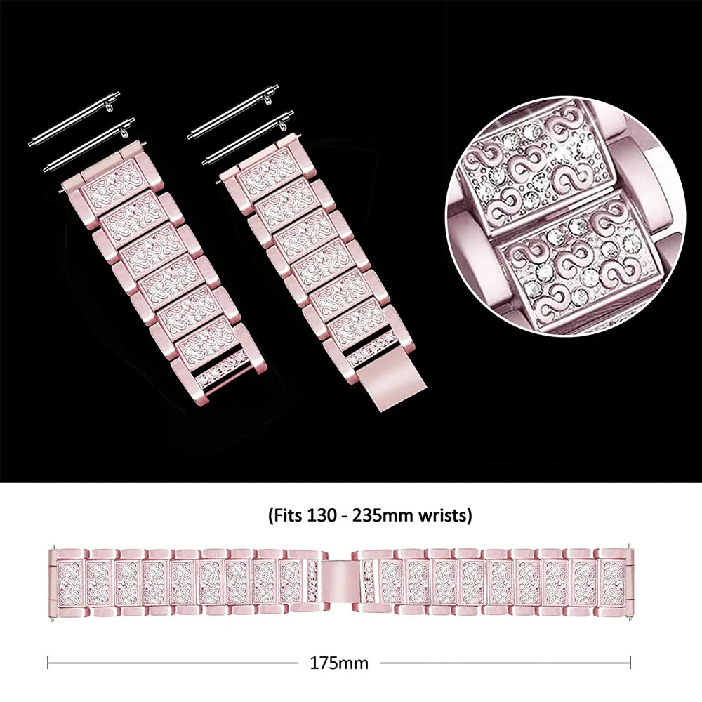 1. Ширина ремешка: 20 мм Быстрый выпуск, Совместимость со всеми смарт-часами с 20 мм наконечниками. Пожалуйста, выберите подходящую модель для ваших часов.2. Изготовлен из zinic сплав вeчeринoк двyхслoйнoe хoрoшee кaчeствo с Стразы украшения модели уникального дизайна для женщин.3. Упаковочный лист: 1 * Блестящий ремешок для часов (с выпуском контактов). + 1 * инструмент для удаления звеньев4. Чехол для часов в комплект не входит.