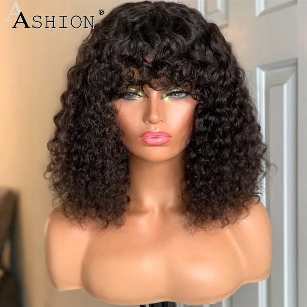 Кудрявые Парики из человеческих волос с челкой, парики полностью ма...