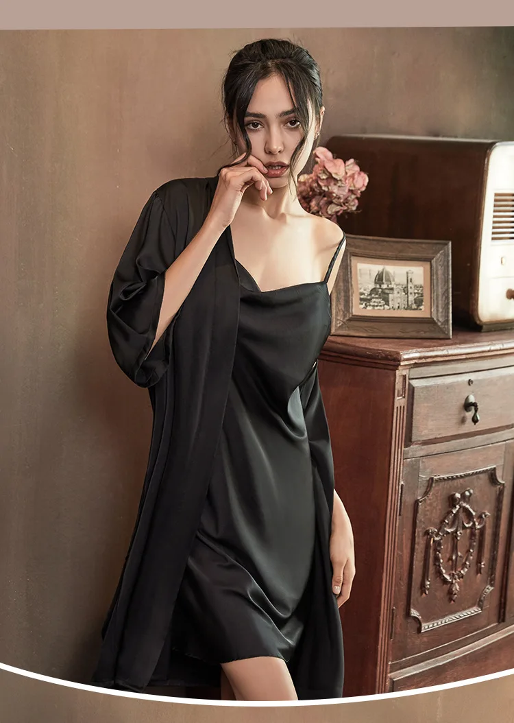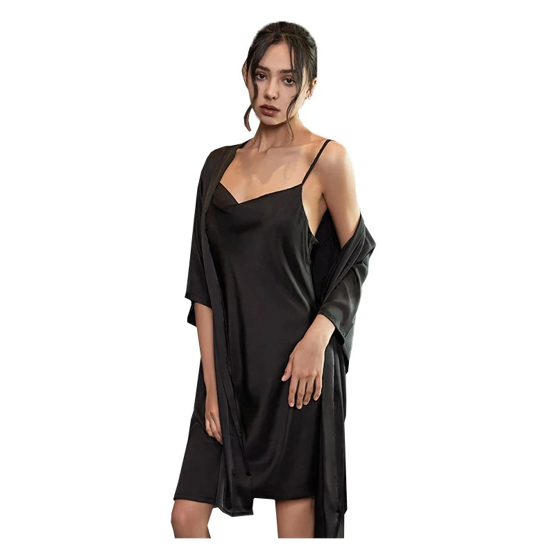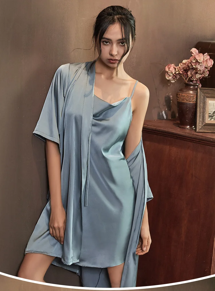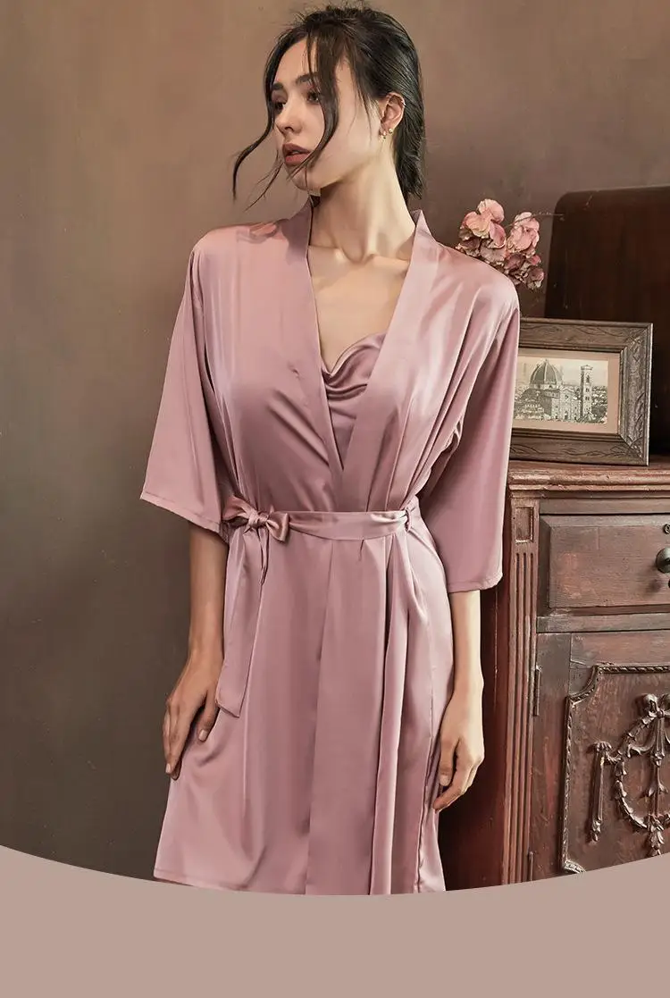 Комплект женский атласный из двух предметов, пикантная одежда для сна на бретелях, ночная рубашка, кимоно с рукавом до локтя, домашняя одежда, весна-лето