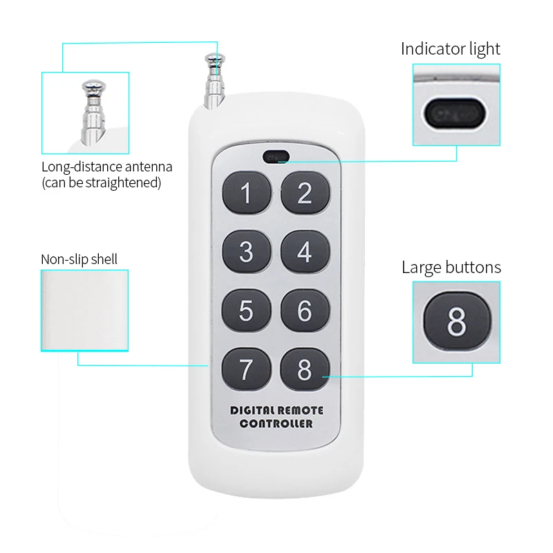 Рабочая частота: 433,92 МГцПитание от батареи 12V2 3A (батарея в комплект не входит),Материал: ПВХ.Кнопка: 4 кнопкиРазмер: 55 мм x 30 ммРабочее напряжение: 12 ВРабочий ток: 12 мАМощность передачи: 10 мВтРежим модуляции: ASK (AM).Тип кодирования: обучение.Расстояние передачи: 80 м.
