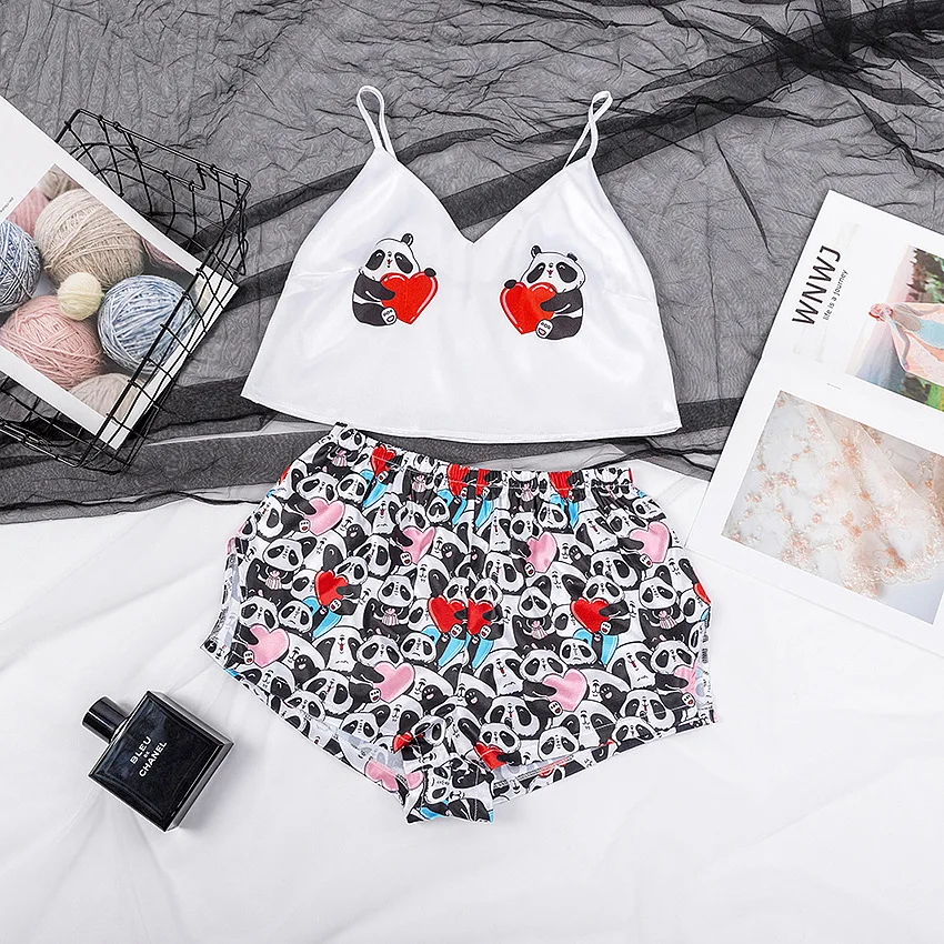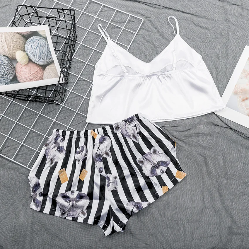 Пикантный пижамный комплект для женщин, одежда для сна с мультяшным принтом животных, на бретельках, без рукавов, женская шелковая пижама, Ночная одежда, домашний костюм