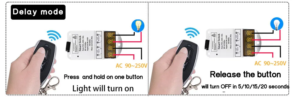 1. Режим защелкиНажмите кнопку-> переключатель включится; Нажмите кнопку B-> переключатель выключится2. Режим задержкиПресс и удерживайте на одной пуговице-> переключатель будет зафиксировано какое-либо движение; Отпустите кнопку-> переключатель выключится через 5/10/15/20 секунд