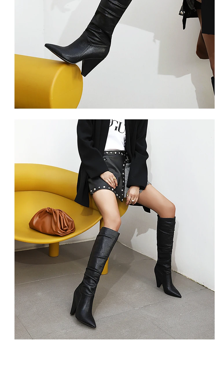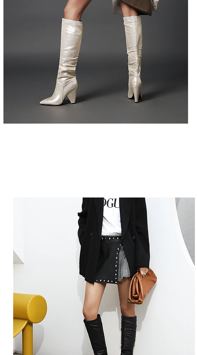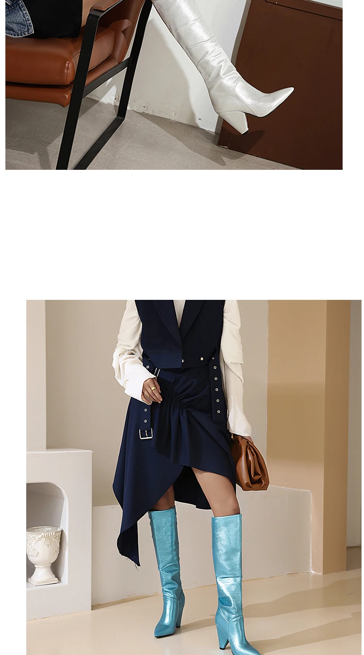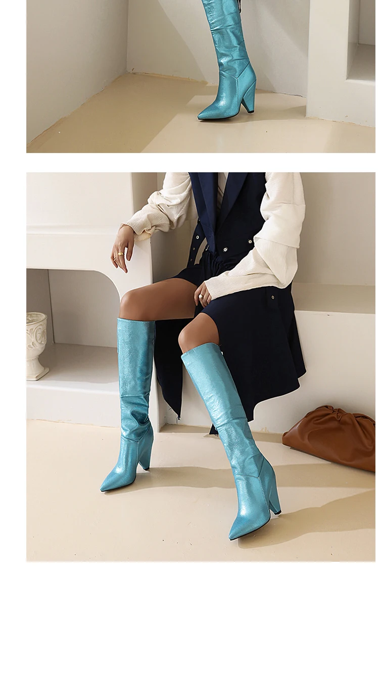 Супер высокий профессиональный каблук на танкетке, блестящая ткань с блестками, модные модельные сапоги, женские сапоги до колена большого размера из металла
