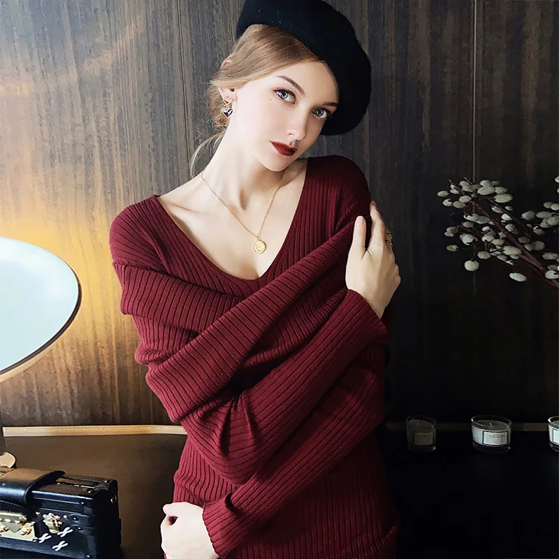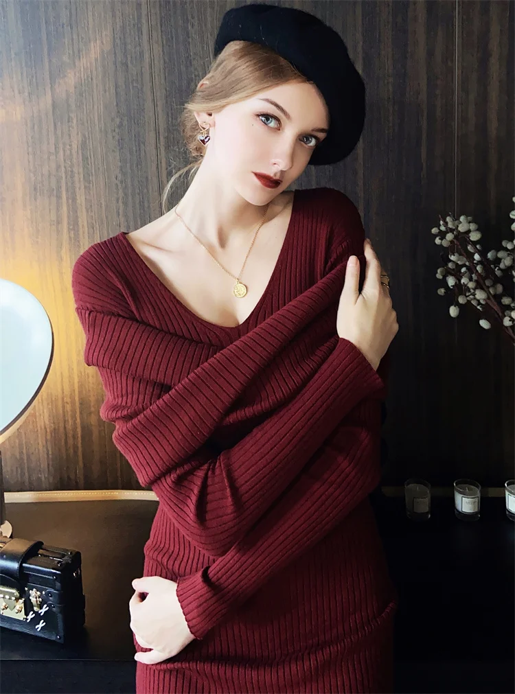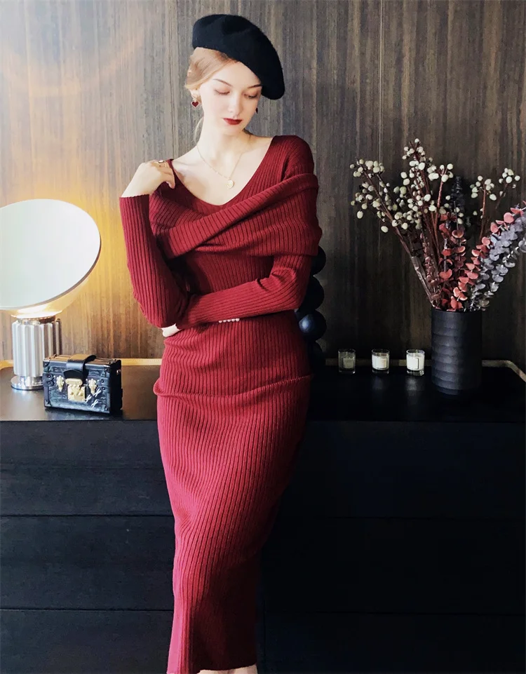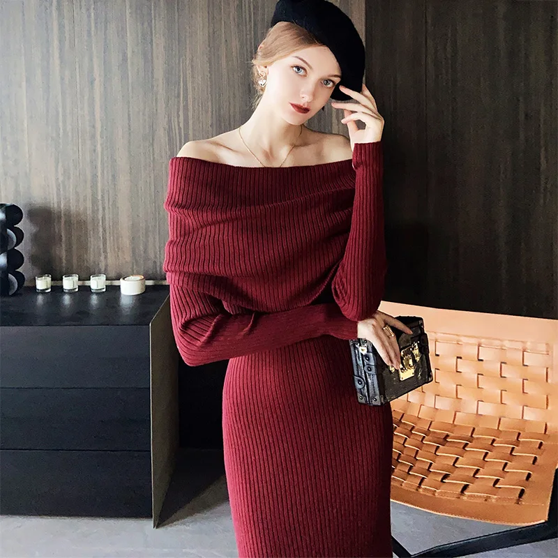 Элегантное женское вязаное платье Dabuwawa с открытыми плечами и длинным рукавом, женское осенне-зимнее мягкое платье-свитер, Дамское офисное платье DO1CDR037
