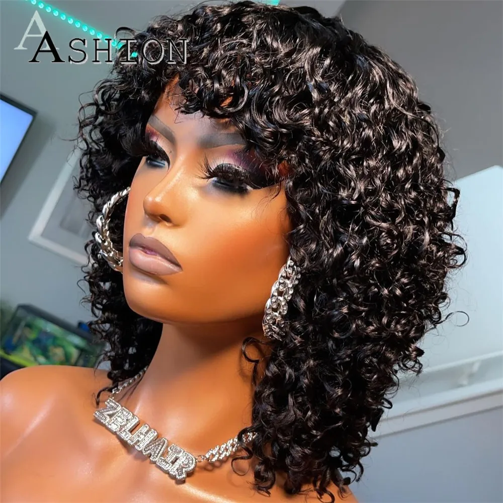 Короткие вьющиеся парики из натуральных волос с челкой полностью ма...