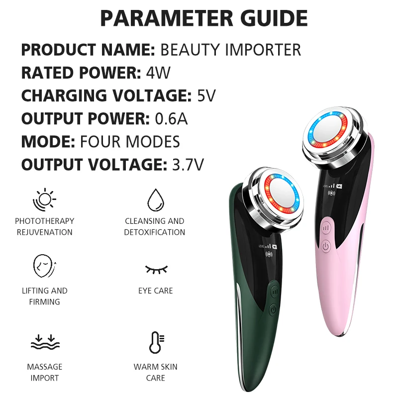Технические характеристики:Размер: высота: 170 мм/6,69 дюйма, длина: 41 мм/1,61 дюйма, ширина: 31 мм/1,22 дюйма, длина массажной головки: 54 мм/2,12 дюймаНоминальное входное напряжение: AC 100V-240V переменного тока, 50/60 ГцВыходное напряжение/ток: DC 5V/1AНоминальное напряжение/Номинальная емкость: 3,7 в/500 мАчНоминальная мощность: 4 ВтРежим: четыре режимаВремя зарядки: около 3 часов (состояние зарядки: Зарядка показывает красный свет, полный дисплей белый свет)Интенсивность передачи: 3 передачиУпаковочный лист:1 * Розничная коробка1 * хост1 * Руководство пользователя1 * USB кабель для зарядкиОсобенности:1.[Положительные и отрицательные ионы] Используя принцип положительного и отрицательного ионного влечения, грязь в глубоких порах разряжается через биологический ток и тщательно очищается. Косметические ингредиенты проникают в нижний слой кожи через ионтофорез.2.[Вибрация] механическая вибрация и стимуляция напряжения принимаются для подтягивания кожи человека, повышения эластичности и улучшения обмена веществ клеток кожи.3.[теплый] теплый массаж способствует впитыванию, растягивает текстуру кожи и делает кожу пухленькой.4.[функция красного и синего света]5.[4 режима] подтяжка кожи, осветление цвета кожи, защита от морщин, удаление морщин, удаление лица, чистая детоксикация.