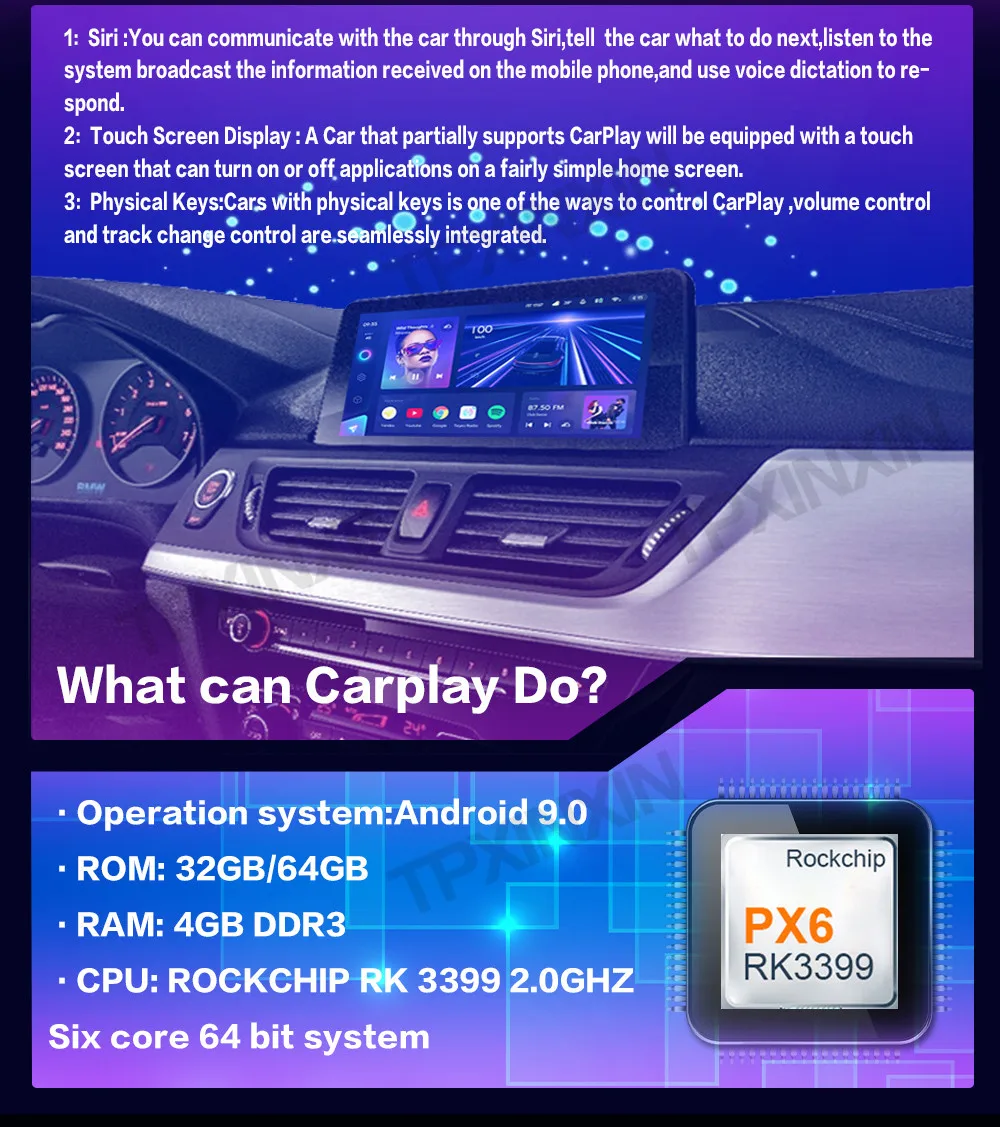 1. Простота установки, подключи и работай, поддерживает все оригинальные функции после установки2. Встроенный Carplay, информация вашего apple или android телефона может синхронизироваться с вашим радио android (на рынке цена carplay составляет не менее 60 долларов США).3. Поддержка Android AUTO4. Поддержка голосового управления-английский5. HDMI-означает поддержку подголовников6. Усилитель TDA 78517. Bluetooth-расширенная версия Qualcomm 5,0 поддерживает NX TX ATTX без потерь качества звука