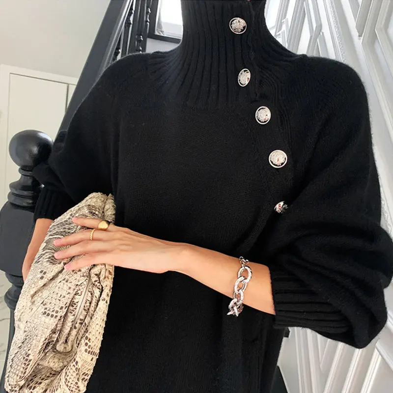 Осень-зима 2021, Женский вязаный пуловер с высоким воротником, пуго...