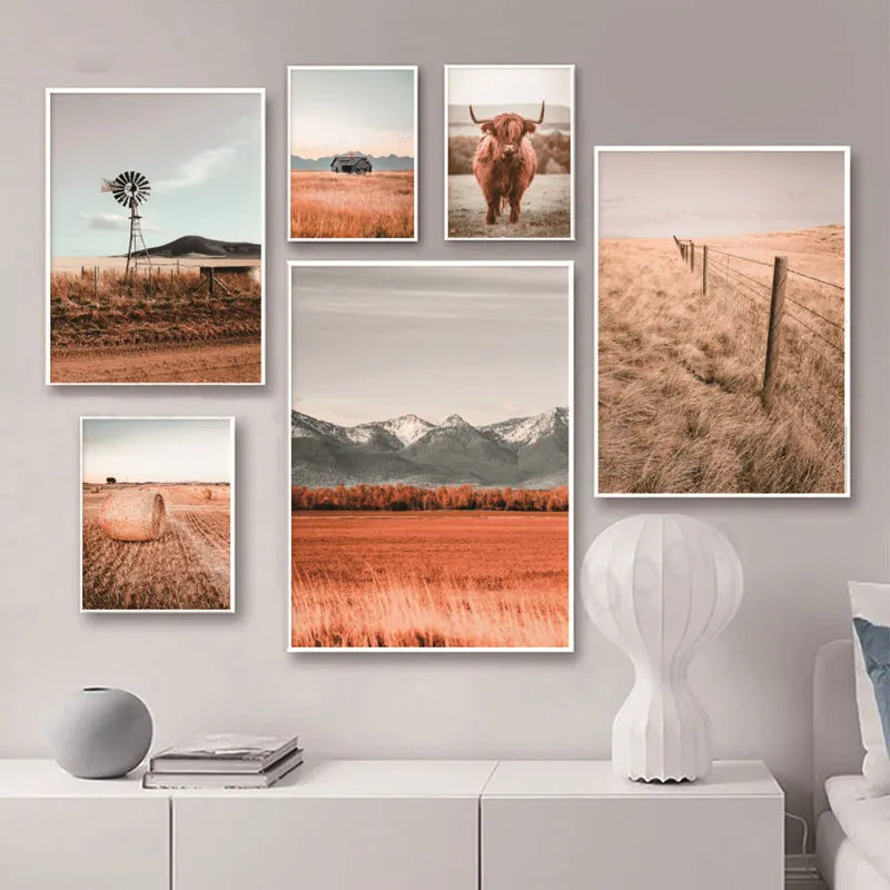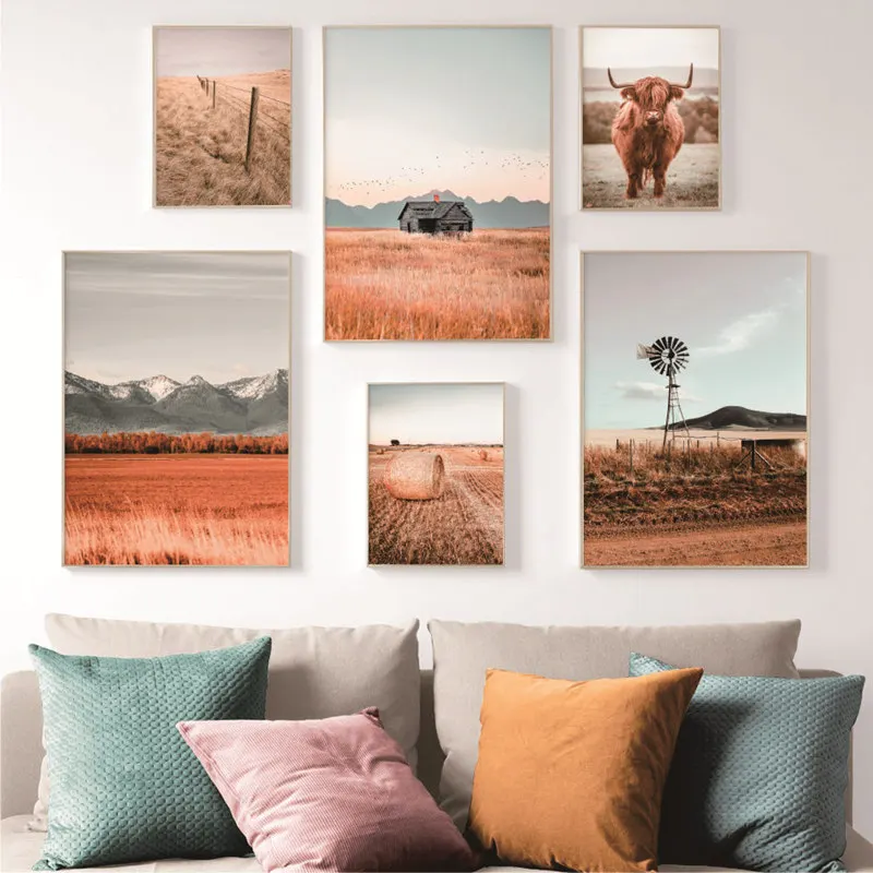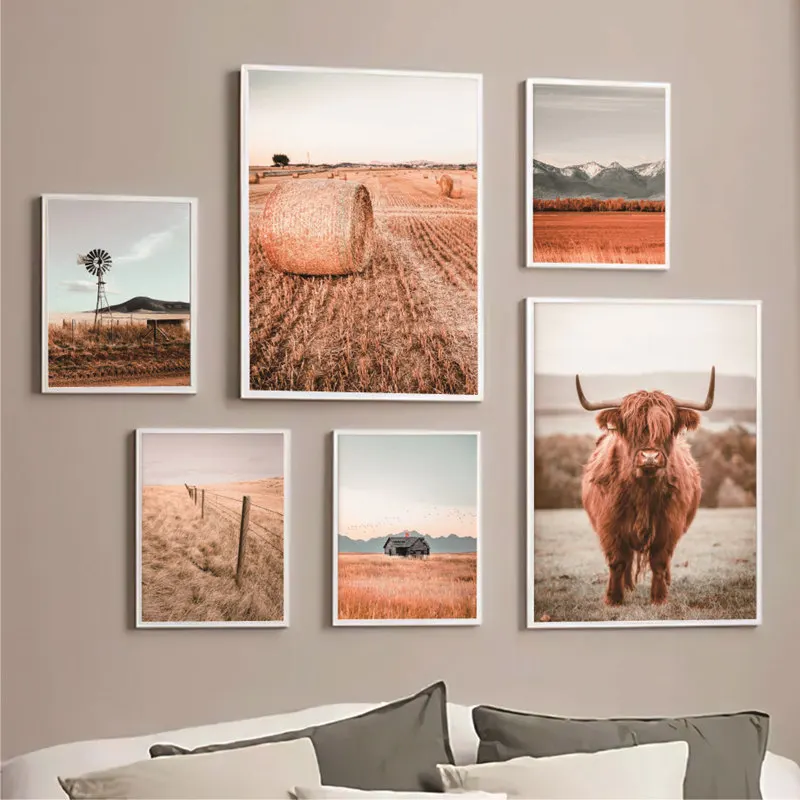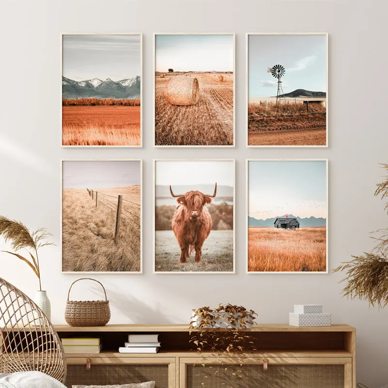 Постер на стену в скандинавском стиле с изображением фермы и пейзажа, постеры на холсте с изображением деревьев и коров, домашний декор для гостиной