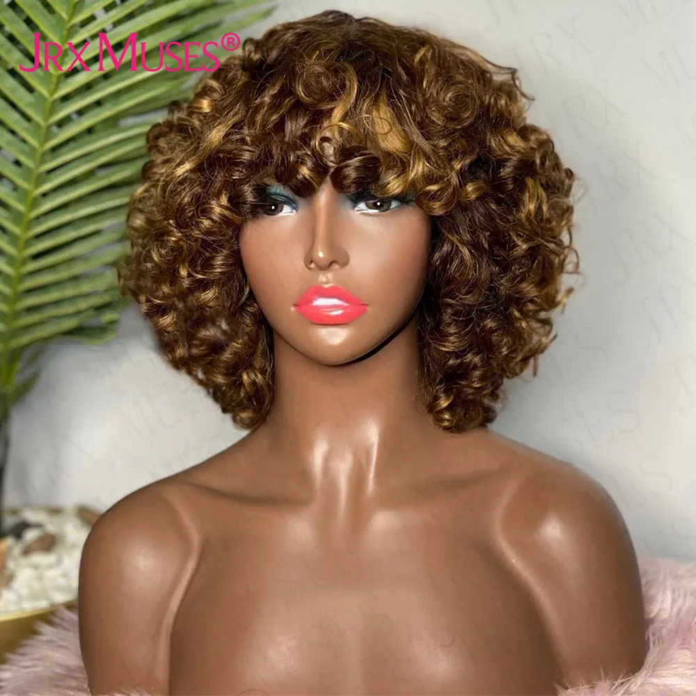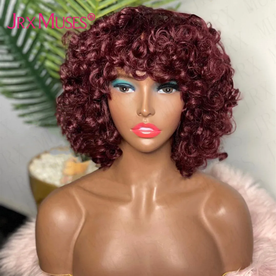 Парики из человеческих волос 99J Fumi, кудрявые, с челкой, короткие, вьющиеся, без клея, машинная работа, бордовые, хайлайтер, светлые цветные парики