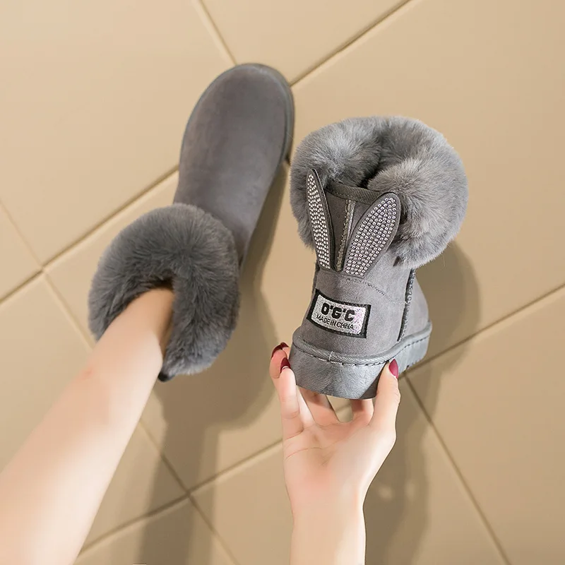Женские ботинки с кроличьими ушками, теплые плюшевые ботинки на пло...