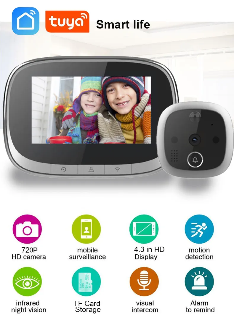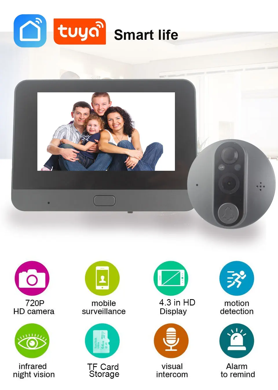 Tuya глазок видео дверной звонок Wifi Дверь просмотра камера Интерком 4,3 ''монитор Обнаружение движения видео-глаз цифровое кольцо